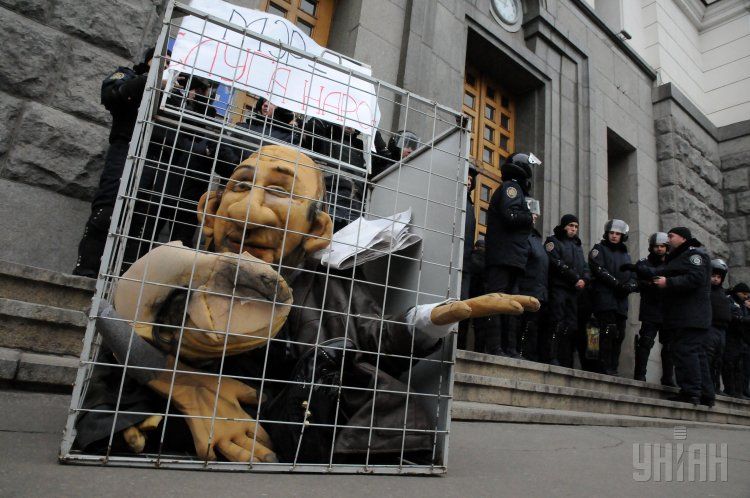 Громадські активісти пікетують першу сесію міськради нового скликання, у Харкові, Сесію пікетували близько 150 громадських активістів. Вони виставили перед входом до міськради ляльки, які зовні схожі на харківського міського голову Геннадія Кернеса та народного депутата від "Опозиційного блоку" Михайла Добкіна. / © УНІАН