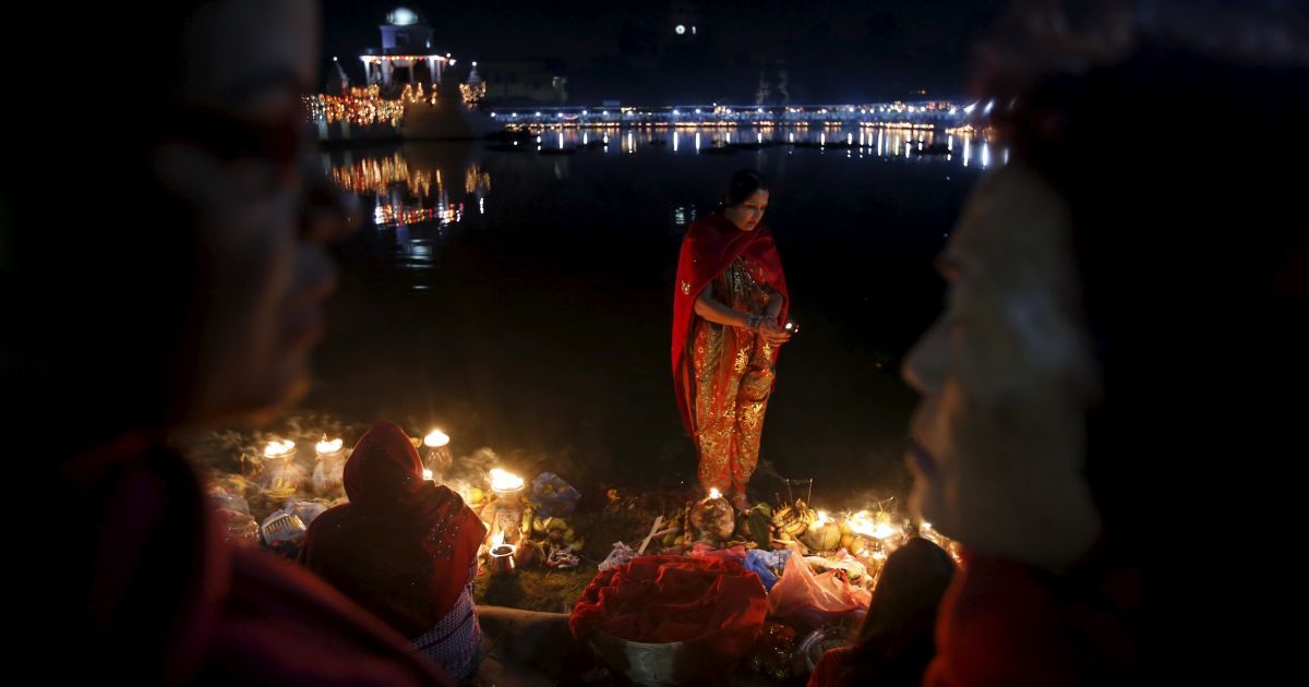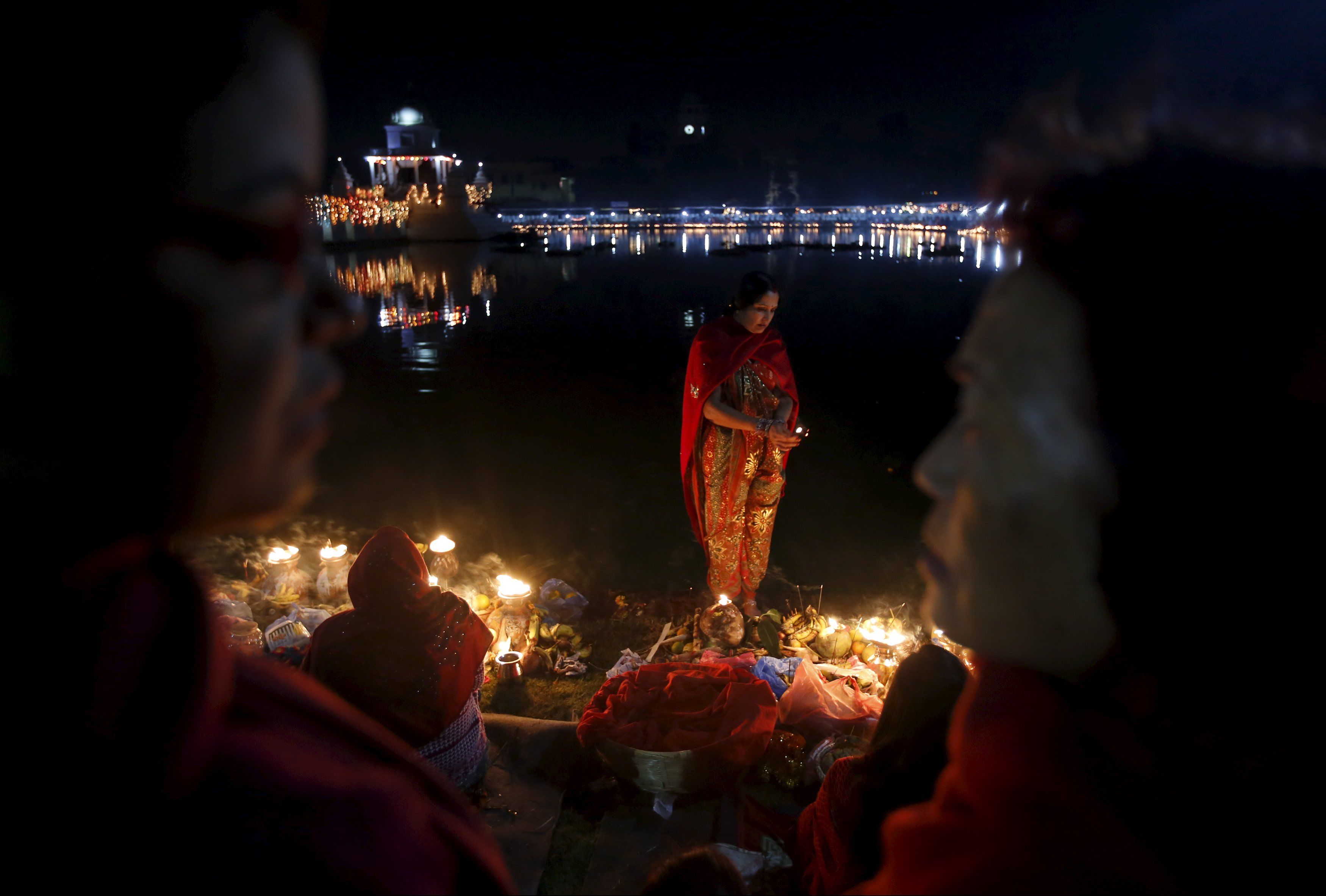 Жінка тримає масляну лампу, очікуючи на схід сонця, щоб помолитися йому під час фестивалю "Чхат" в Катманду, Непал. Індуси в Непалі святкують "Чхат", чотириденний фестиваль на честь бога сонця. Вони моляться на сході і заході сонця і таким чином шукають благословення для своїх родин. / © Reuters