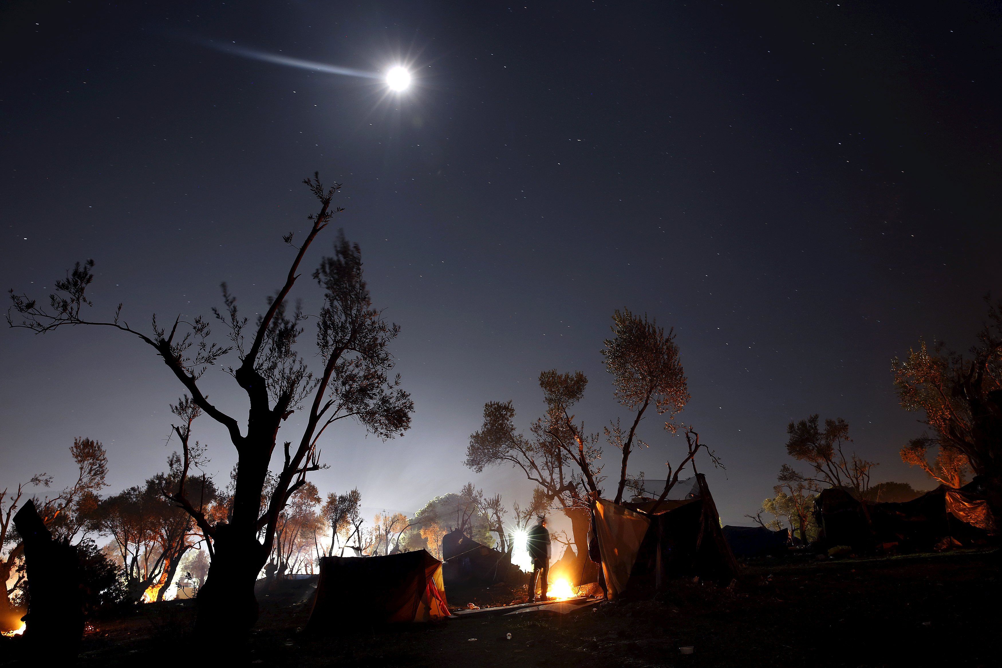 Біженець гріється біля вогню у таборі поруч із реєстраційним центром на грецькому острові Лесбос. Управління з питань біженців ООН звернулося до грецької влади із проханням створити додаткові приміщення для прийому мігрантів, оскільки зараз є лише 2800 місць, тоді як на острові знаходиться 12 тисяч біженців. / © Reuters