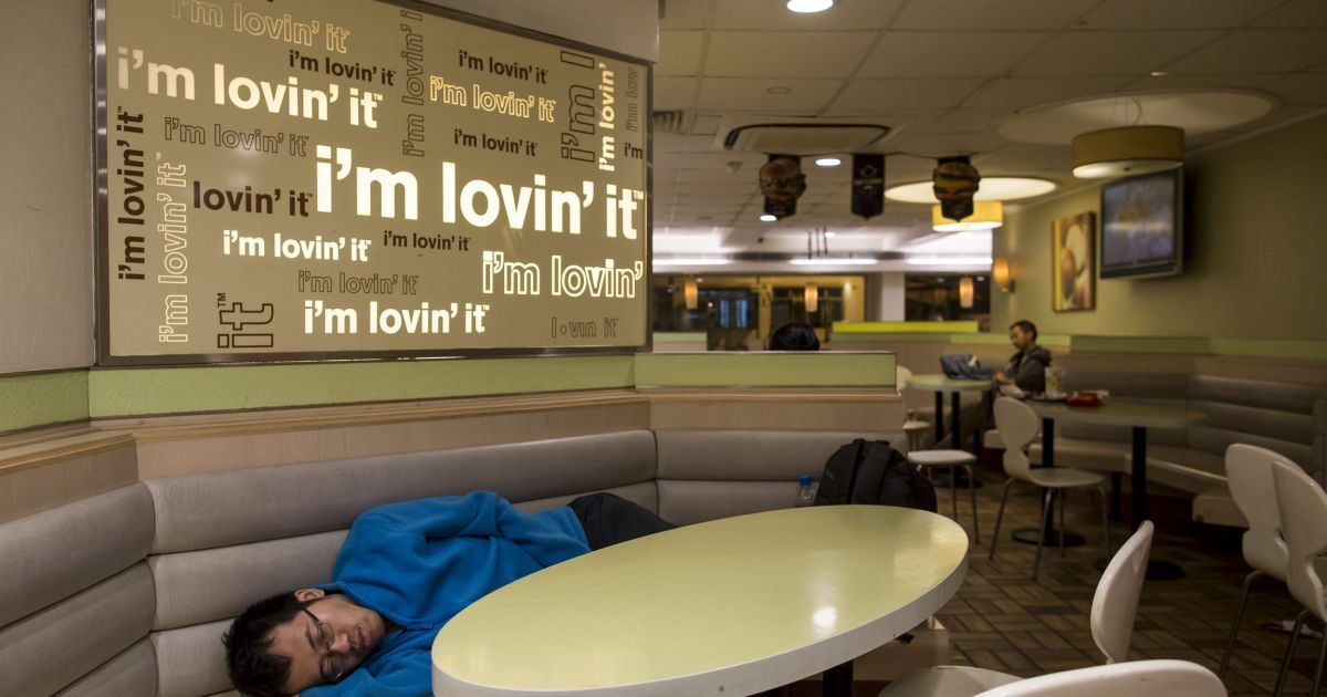 Людина спить в цілодобовому ресторані Макдональдс у Гонконзі, Китай. В останні роки такі ресторани стали популярною альтернативою для бездомних людей, які не можуть дозволити собі житло через високу орендну плату і зростанням цін на нерухомість. / © Reuters