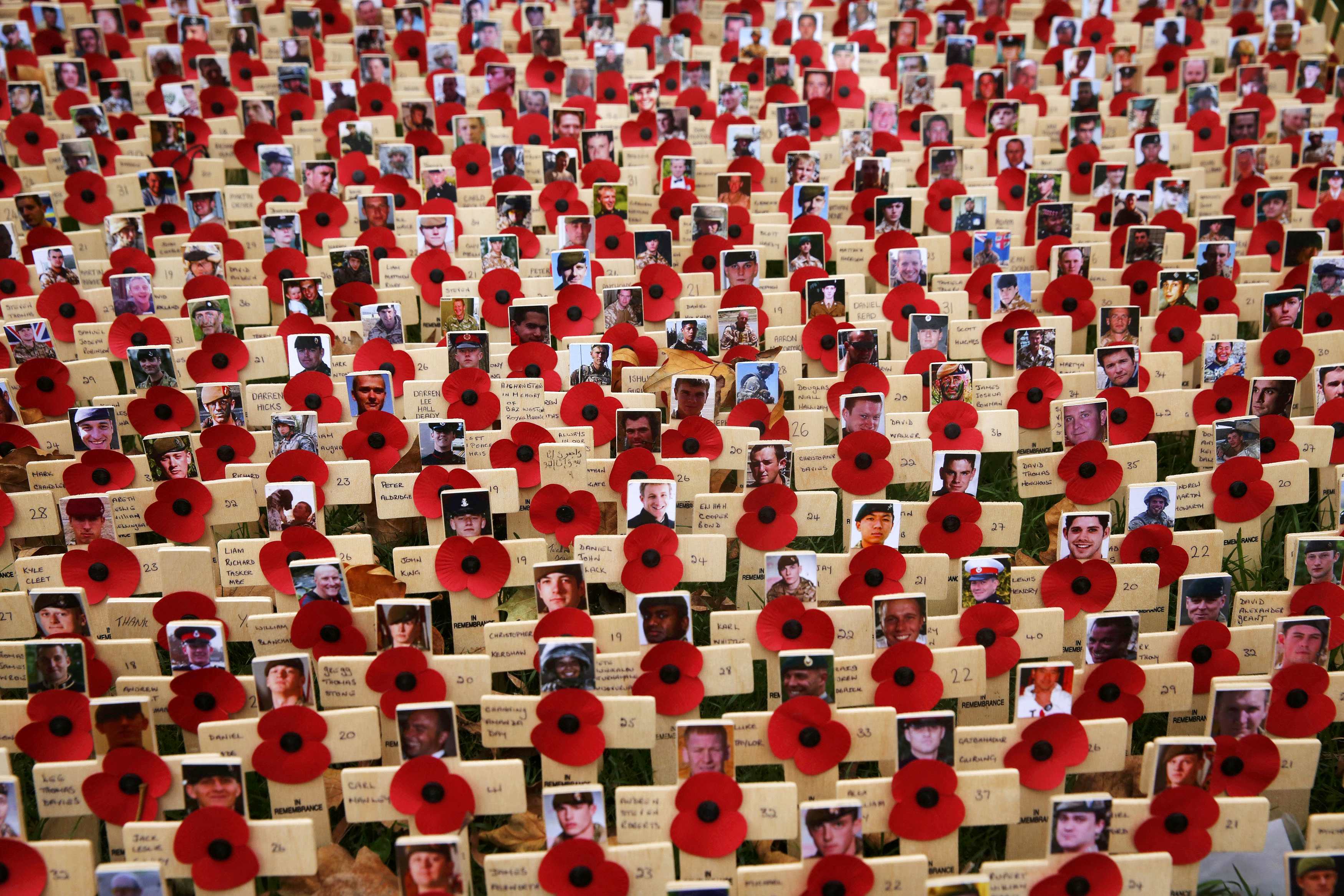 Фотографії загиблих воїнів розміщені на хрестах поблизу Вестмінстерського абатства у центрі Лондона, Великобританія. 11 листопада Британія та деякі інші західні країни відзначає День пам’яті, коли вшановують загиблих у Першій та Другій світових війнах та в конфліктах, які сталися пізніше. / © Reuters