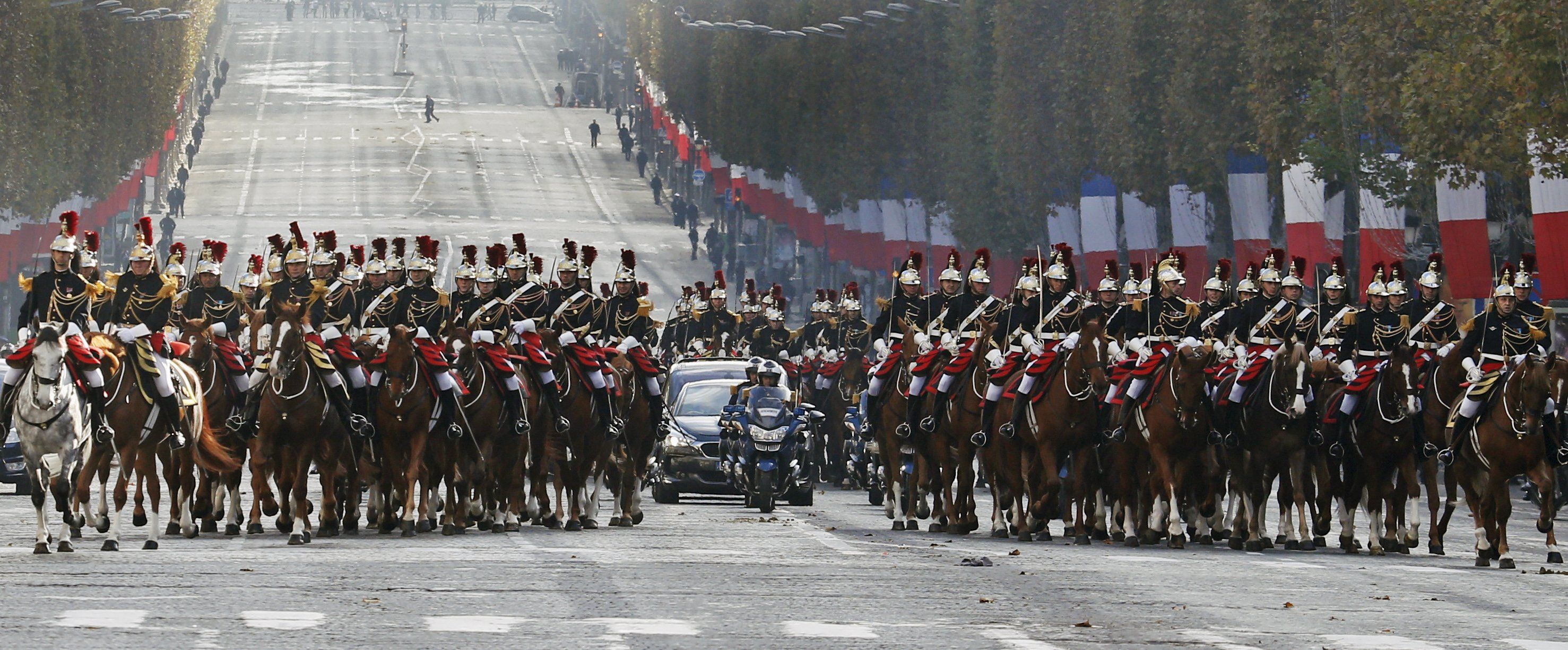 Республіканська гвардія на мотоциклах і конях супроводжує президента Франції Франсуа Олланд у той час, як він прибув на святкування Дня пам’яті біля Тріумфальної арки у Парижі, Франція. / © Reuters