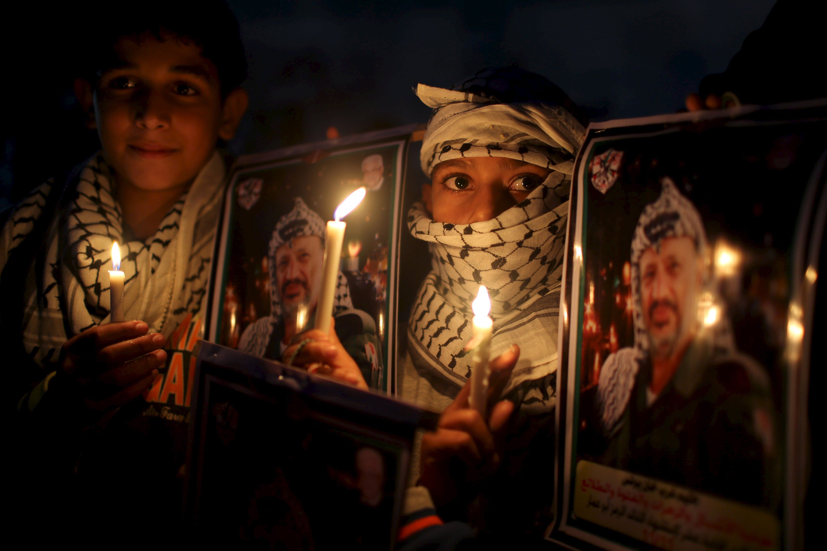 Палестинські хлопчики тримають свічки під час акції з нагоди 11-ї річниці з дня смерті палестинського лідера Ясира Арафата, і містечку Хан-Юніс на півдні сектора Газа. Арафат помер 11 листопада 2004 року. / © Reuters