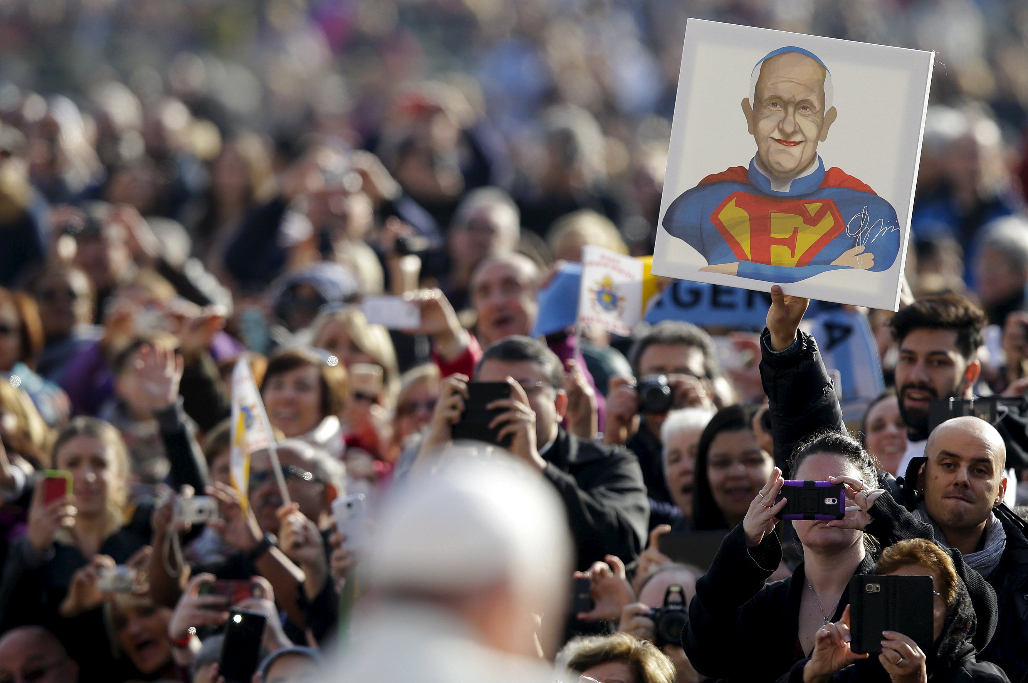 Папа Римський Франциск стоїть перед картиною, яка зображає його як Супермена, під час щотижневої аудиторії на площі Святого Петра у Ватикані. / © Reuters