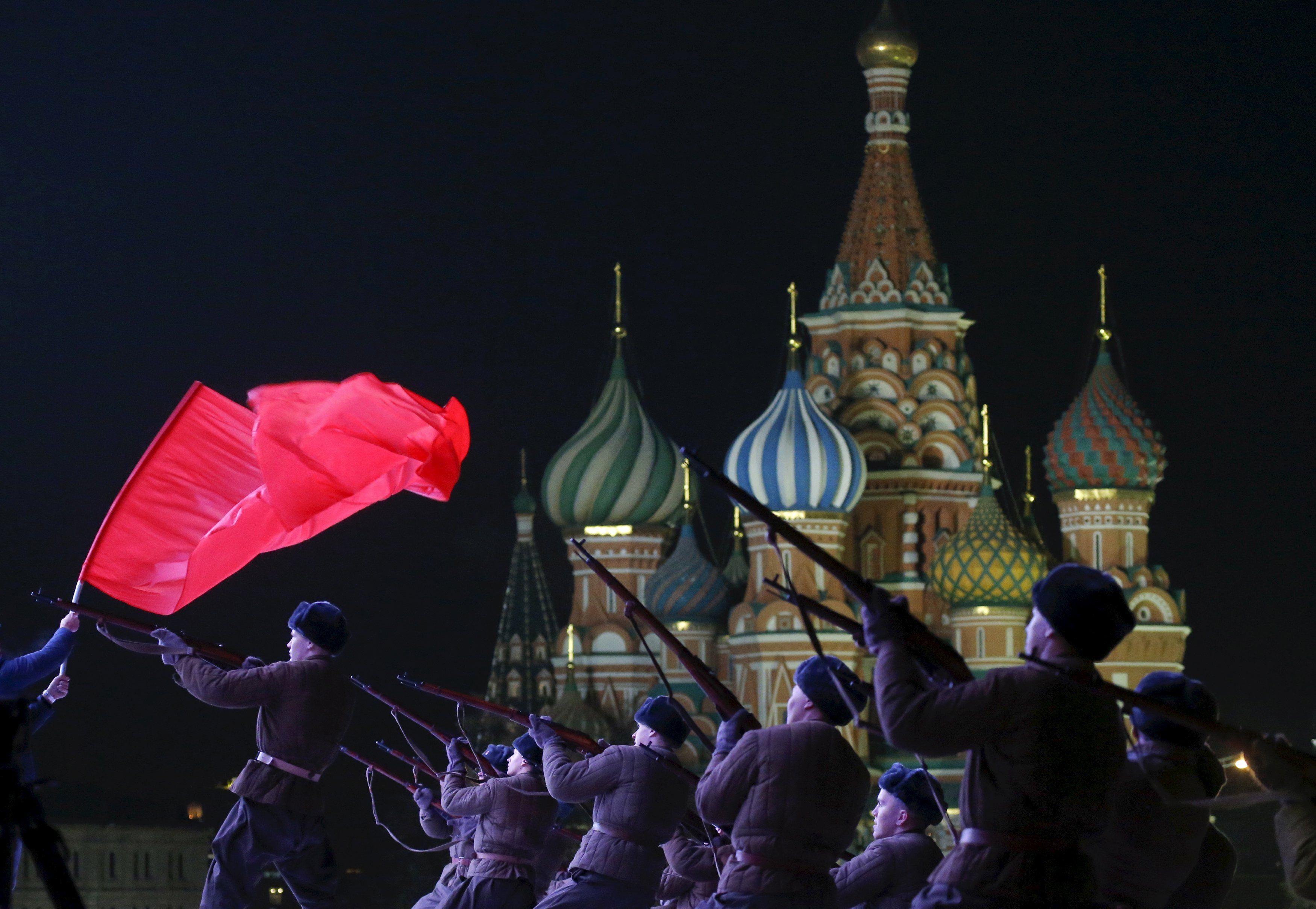 Російські військові, одягнені в історичні уніформи, взяти участь у репетиції військового параду перед собором Василя Блаженного на Красній площі в центрі Москви. Парад відбудеться 7 листопада в честь річниці параду у 1941 році, коли радянські солдати йшли по Червоній площі у бік лінії фронту під час Другої світової війни. / © Reuters