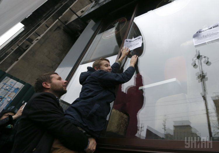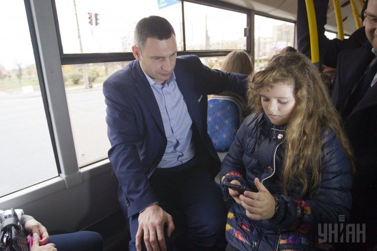 Мер Києва Віталій Кличко їде в автобусі №114 "Вулиця Милославська – залізничний вокзал Центральний. 12 листопада Кличко разом з пасажирами проїхався з Троєщини до центру міста новим автобусним маршрутом №114. / © УНІАН