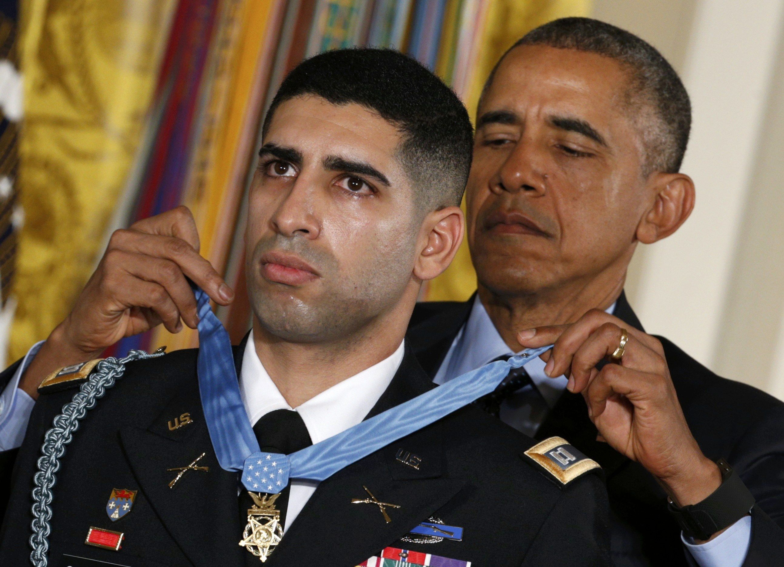 Президент США Барак Обама нагороджує капітана армії США у відставці Флорана Гроберге почесною медаллю під час церемонії в Білому домі у Вашингтоні. Гроберг був нагороджений за знешкодження терориста-смертника в Афганістані 8 серпня 2012 року. / © Reuters