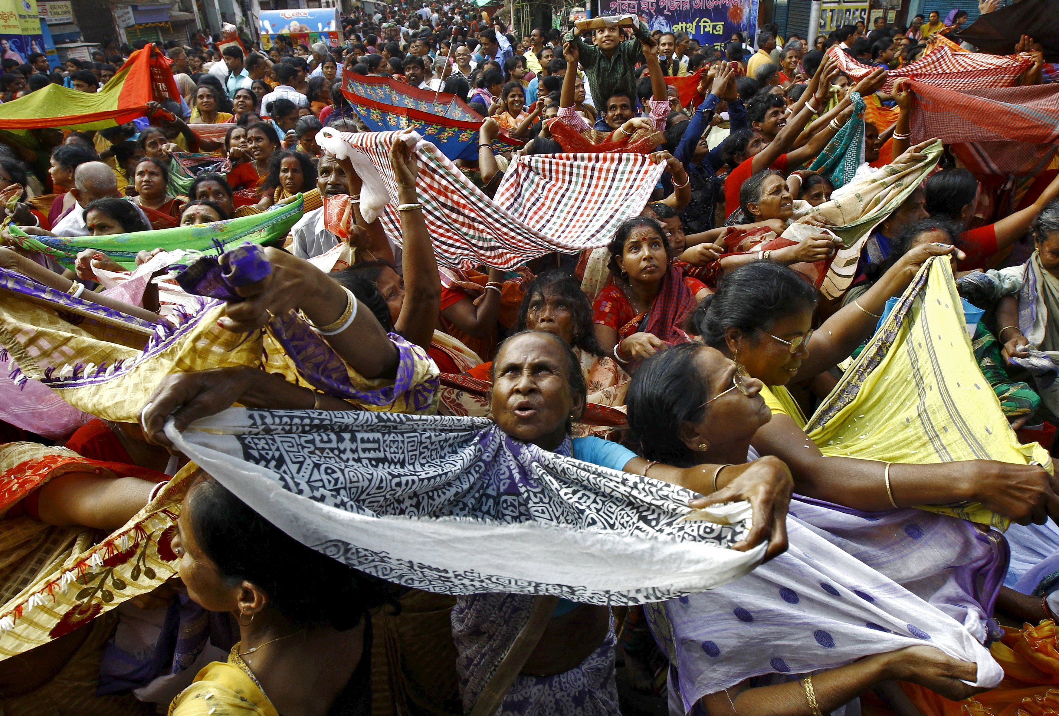 Індуїстські віруючі тримають шарфи, щоб отримати рис, який роздають у храмі з приводу фестивалю Аннакут у Калькутті, Індія. Аннакут відзначається в перший день повного місяця, під час свята 56 типів продуктів харчування роздаються віруючим. / © Reuters