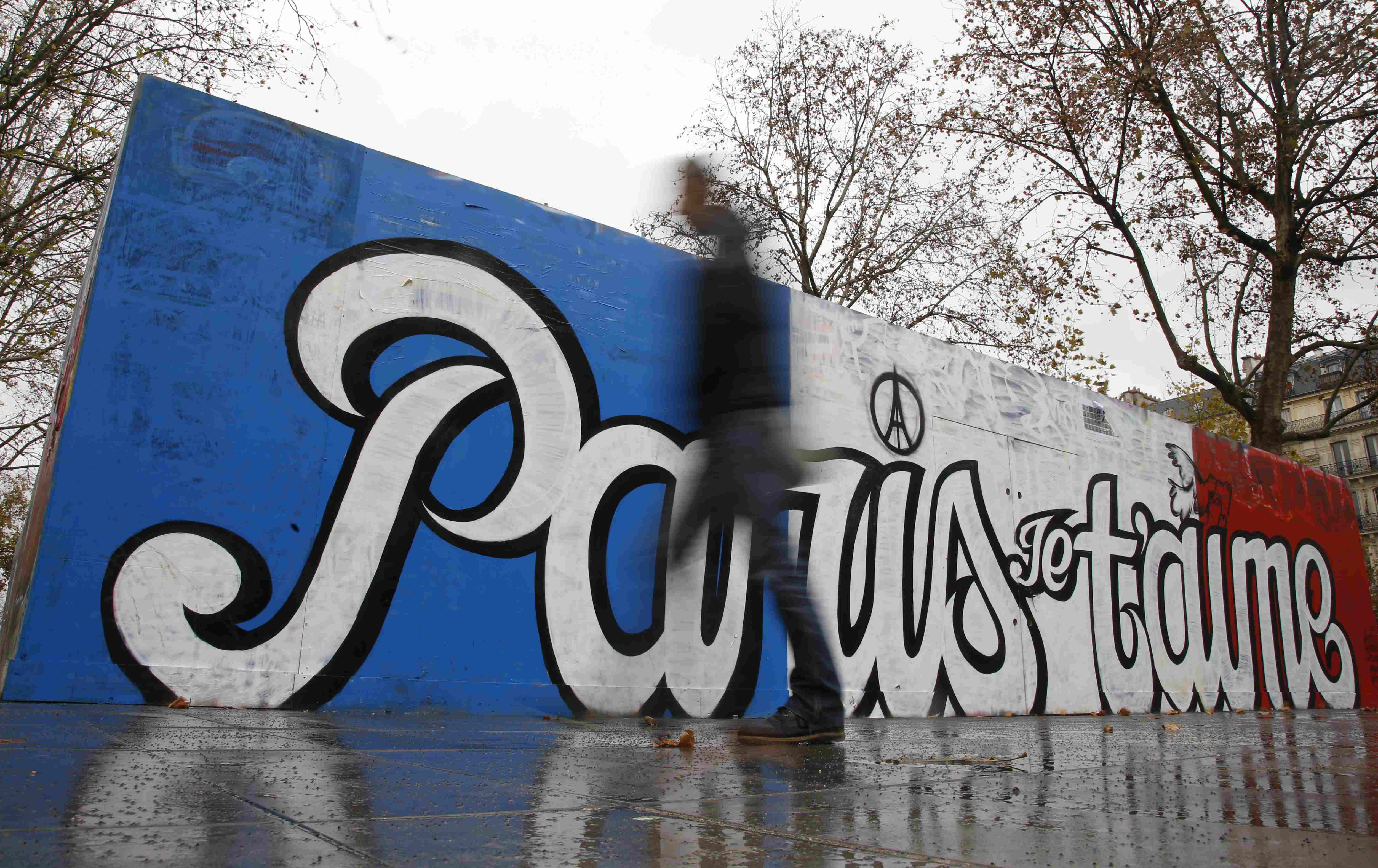 Людина проходить повз недавно намальоване графіті, на якому написано "Париж, я тебе люблю" на Площі Республіки у Парижі. Це графіті з’явилося після серії терактів 13 листопада, внаслідок яких загинули 129 людей. / © Reuters