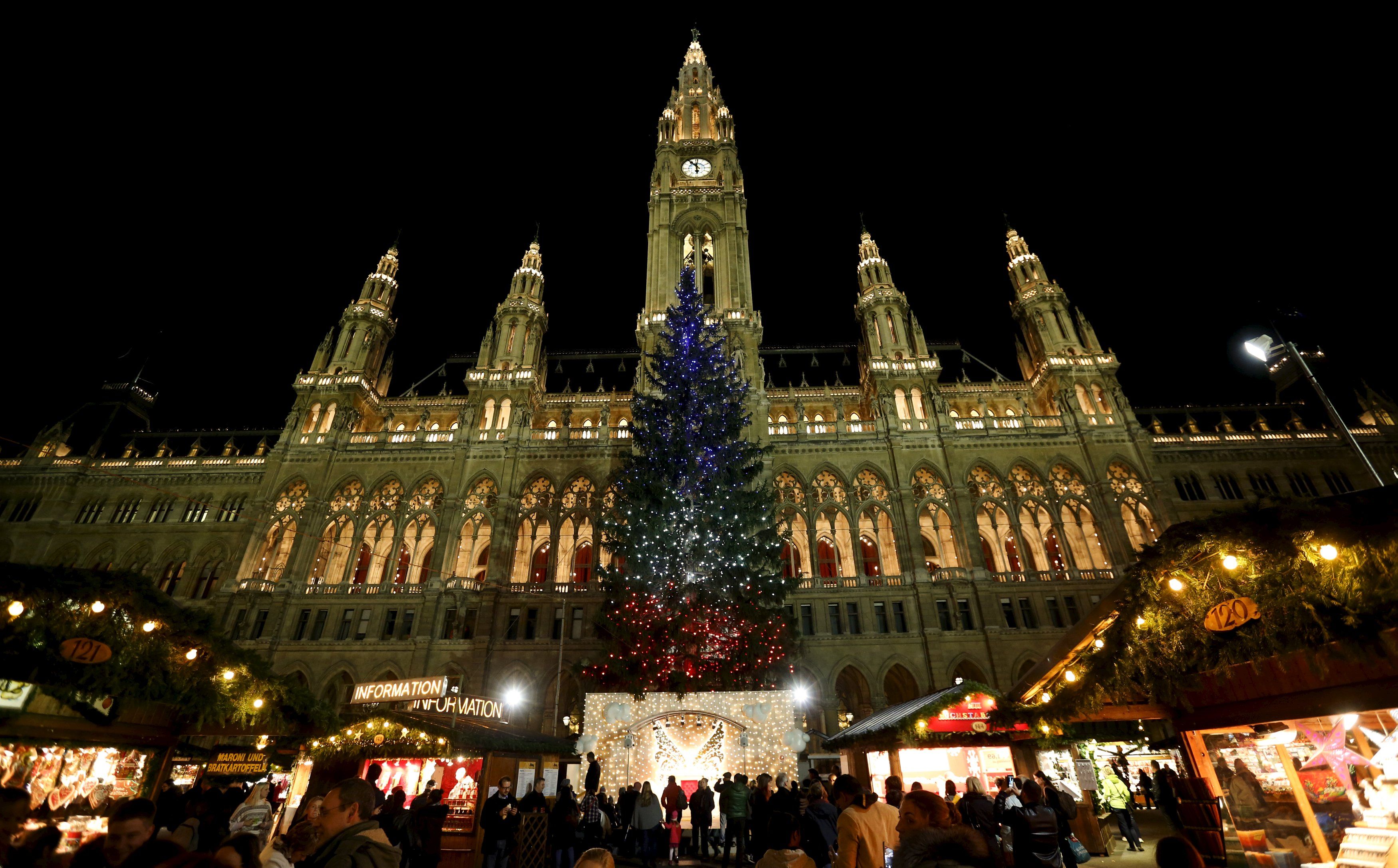Різдвяна ялинка горить синім, білим і червоним кольорами національного прапору Франції в пам'ять про жертв нападу в Парижі перед міською ратушею у Відні, Австрія. / © Reuters