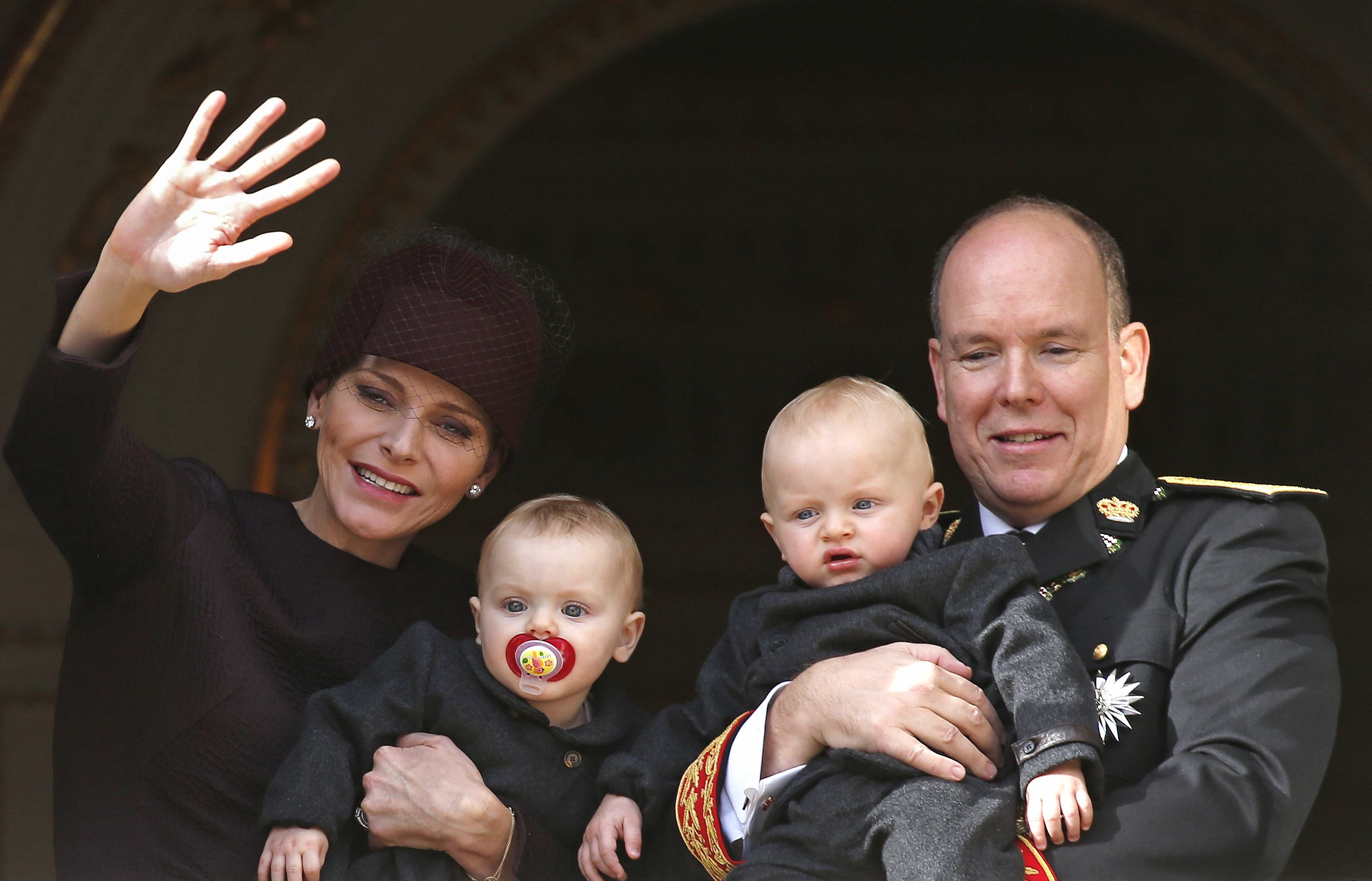 Князь Монако Альберт II та його дружина княгиня Шарлін тримають їхніх близнюків принца Жака ті принцесу Габріеллу, стоячи на балконі свого палацу під час святкування Національного дня Монако. / © Reuters