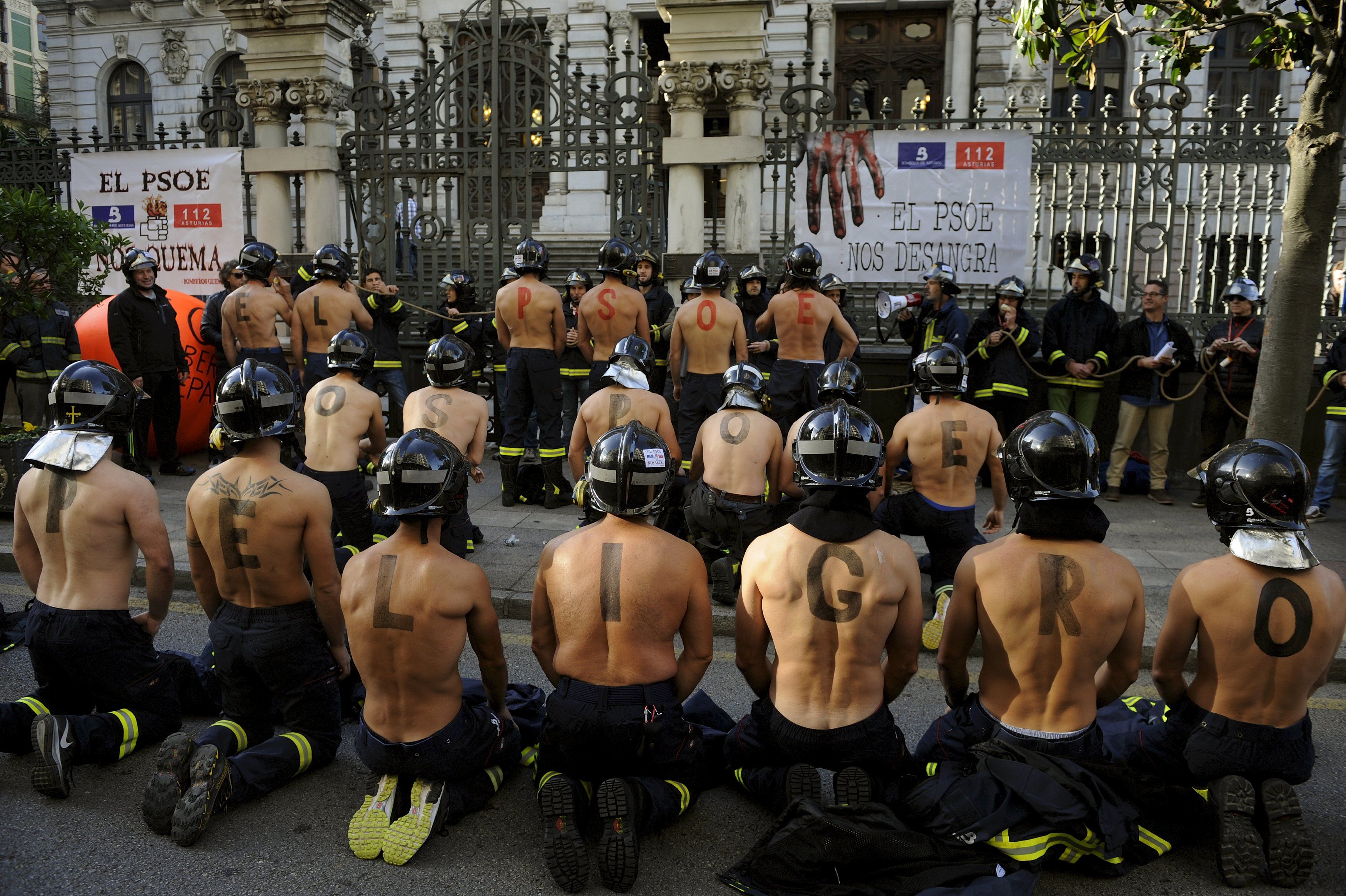 Пожежники беруть участь в акції протесту перед регіональним парламентом Астурії, Іспанія, вимагаючи більш високої заробітної плати і посилення норм громадської безпеки. Букви, написані на чоловічих спинах, утворюють слова, які читаються як "PSOE (Соціалістична партія Іспанії) ставить вас у небезпеку". / © Reuters