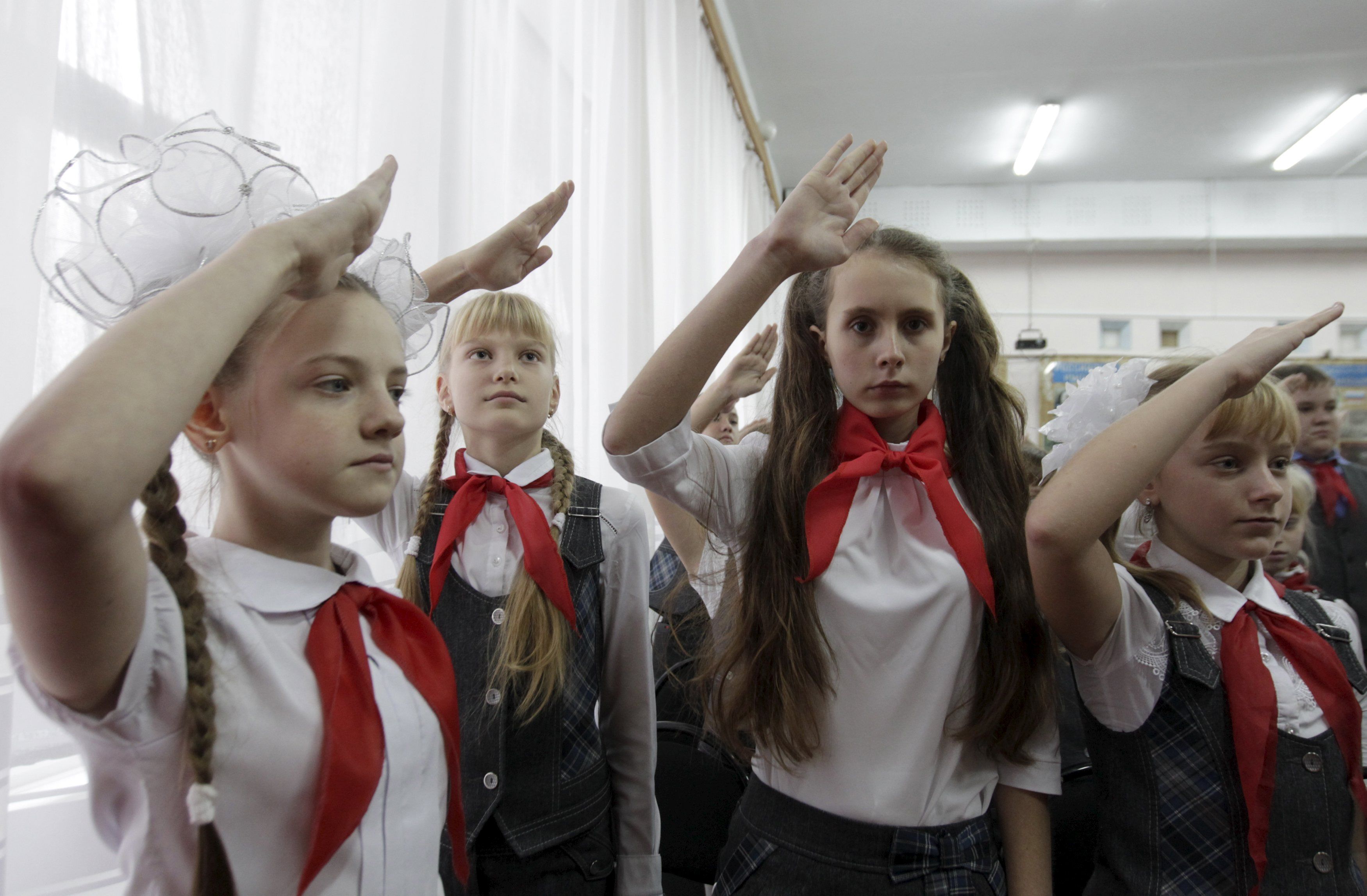 Діти, одягнені в червоні хустки, салютують під час церемонії вступу у піонери 18 нових членів у місцевій школі в селищі Казьминське у Ставропольському краї, Росія. У той час як СРСР-івська піонерська організація втратила свій вплив серед студентів в пострадянській Росії, деякі освітні установи і сім'ї продовжують нести цю традицію. / © Reuters