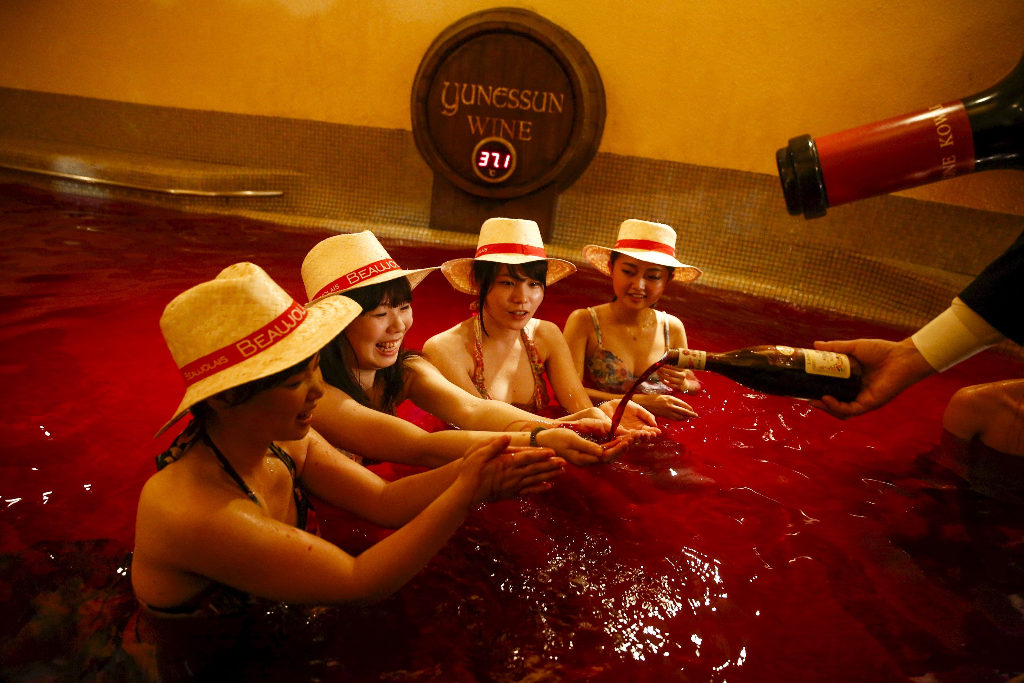 Чоловік наливає вино в стакани жінок, які сидять в гарячій ванні з кольорової води, що символізує вино у курортному японському місті Хаконе під час заходу з нагоди Дня Божоле Нуво. / © Reuters