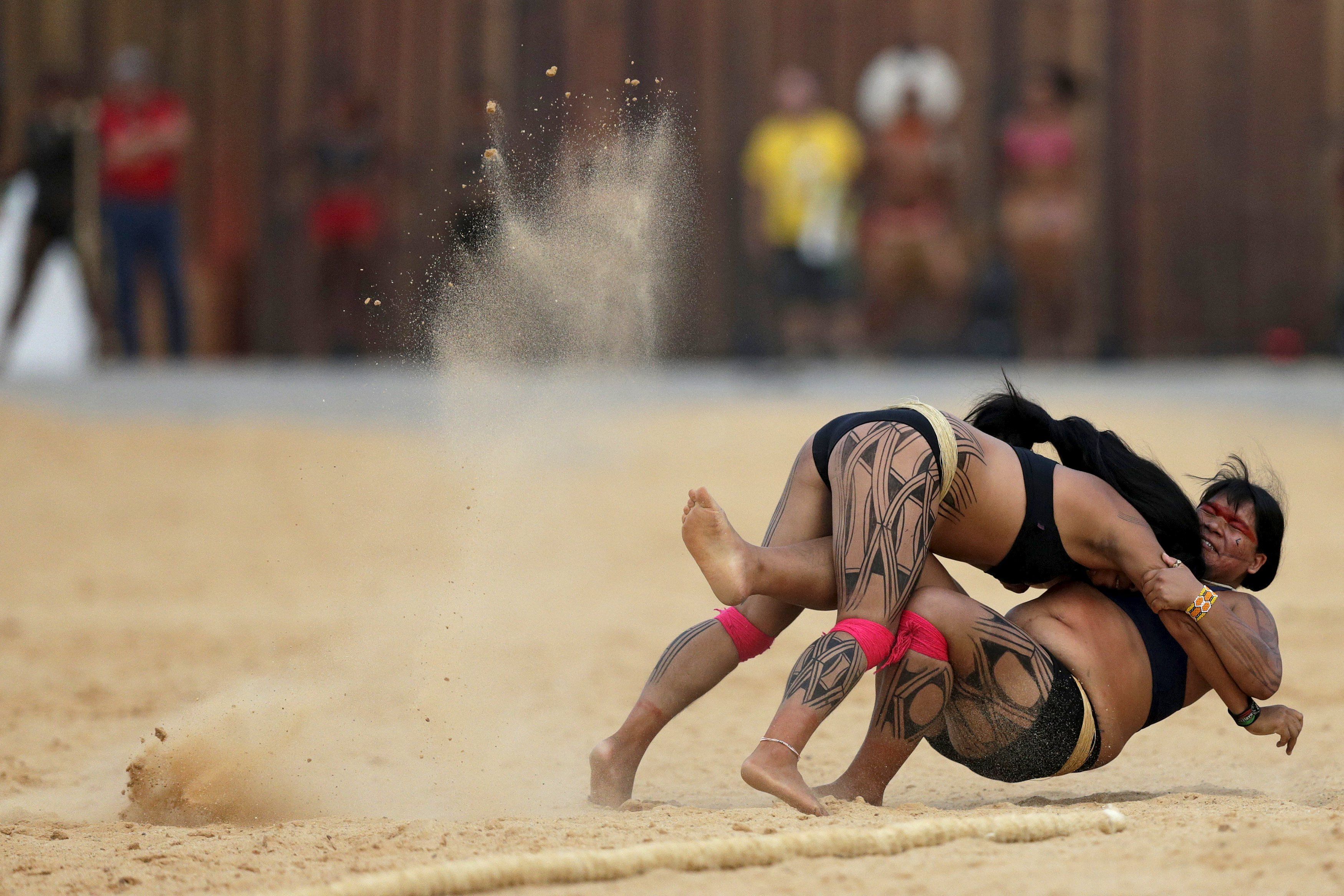 Жінки з племені Камаюра беруть участь у сутичці боротьби Хука Хука на перших Всесвітніх іграх для корінних народів в місті Пальмас, Бразилія. / © Reuters