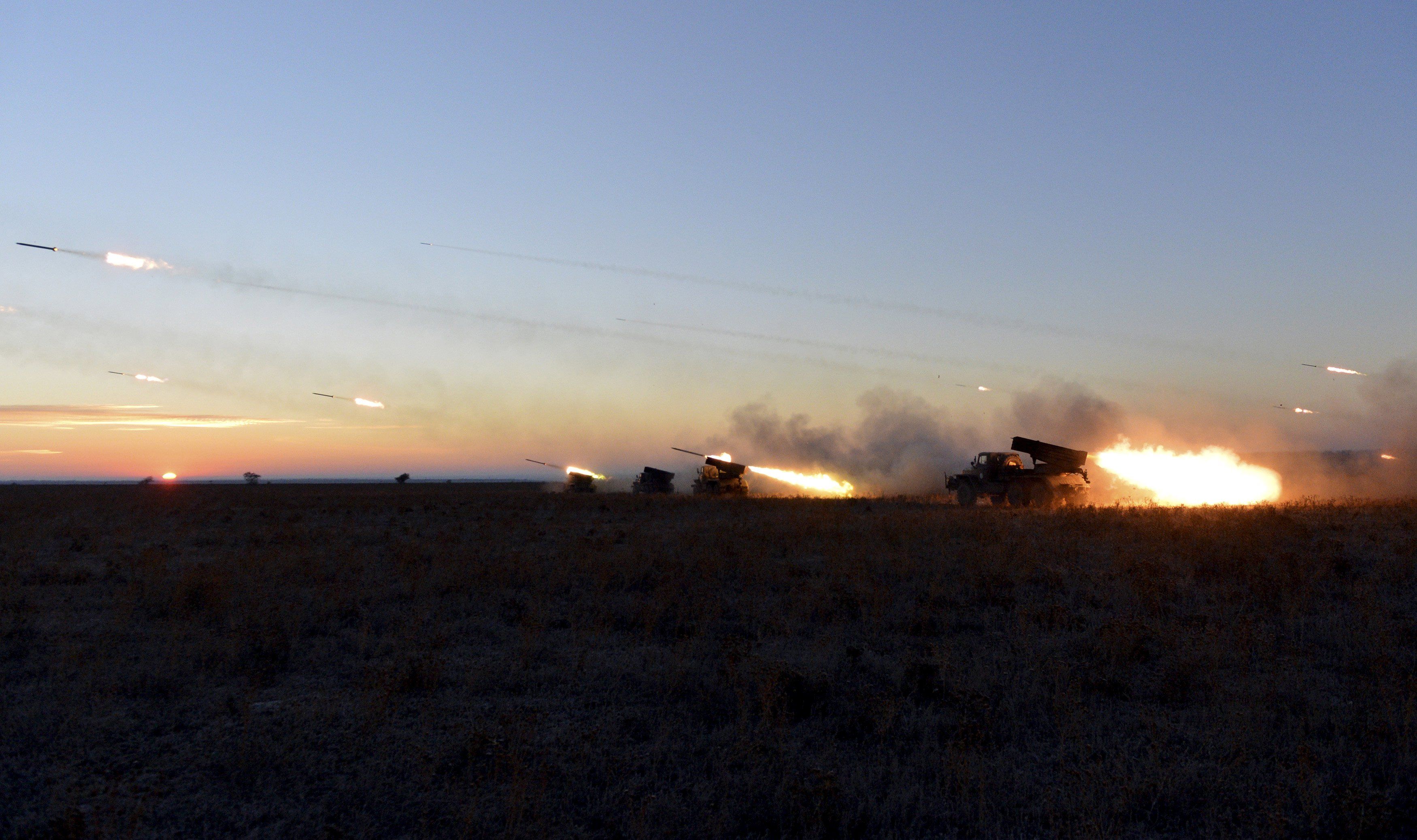 Кілька “Градів” стріляють під час військових навчань українських Збройних сил на полігоні Широкий Лан у Миколаївській області. Військові навчання, в яких брали участь військово-повітряні сили, самохідні транспортні засоби та інше озброєння, були спрямовані на взаємодію між різними підрозділами армії. / © Reuters