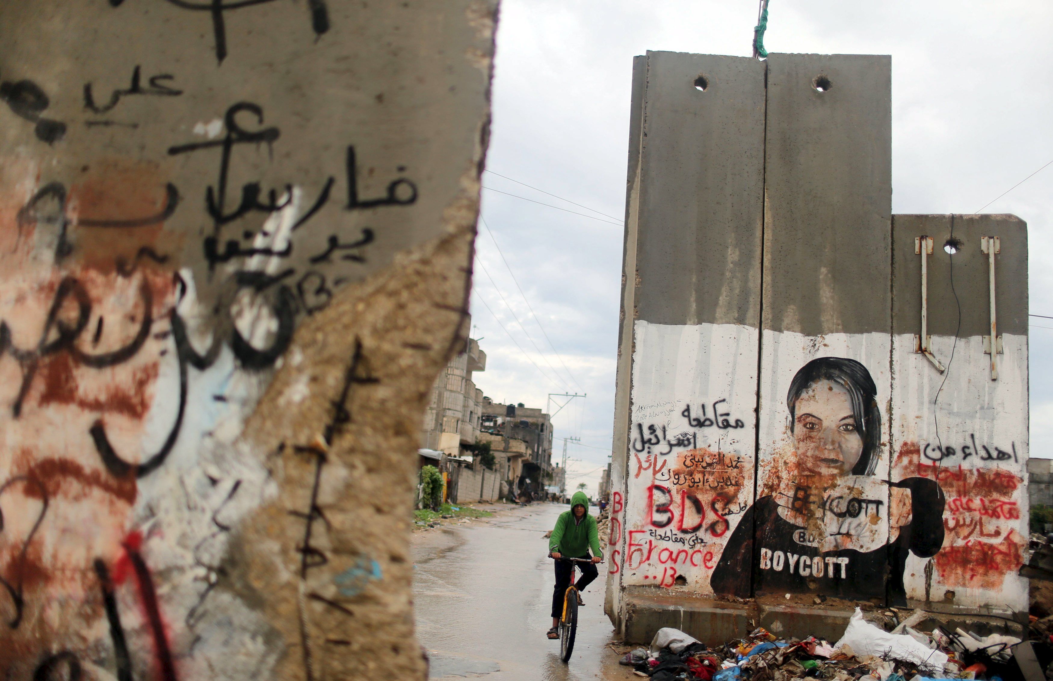 Палестинець їде на велосипеді повз стіни з графіті у дощовий день в Хан-Юніс на півдні сектора Газа. / © Reuters
