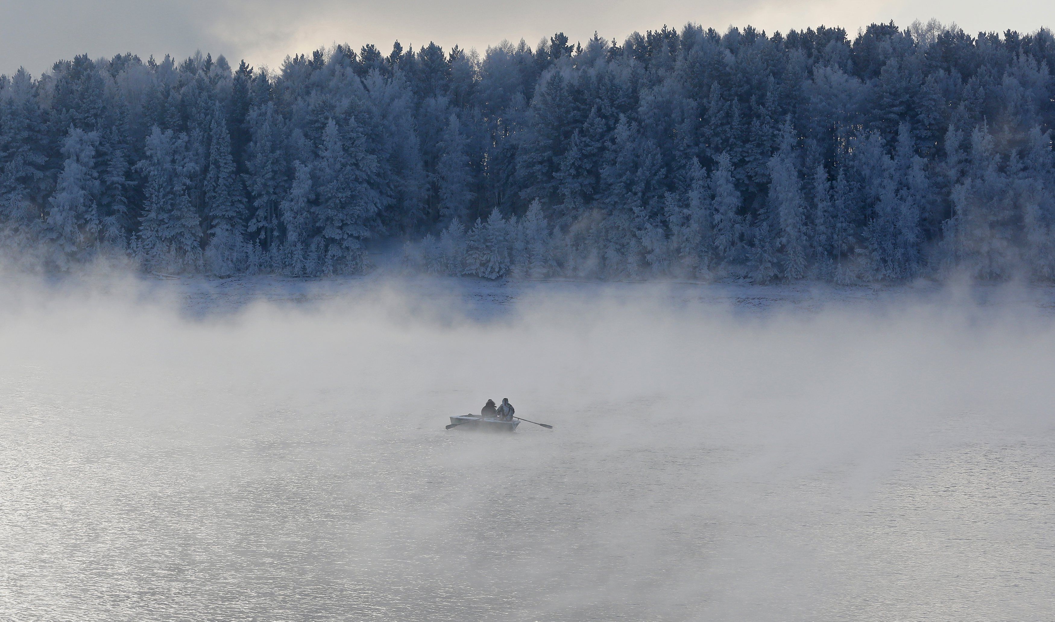 Двоє чоловіків гребуть на човні через морозний туман вздовж річки Єнісей при температурі повітря мінус 20 градусів Цельсія в районі тайги за межами сибірського міста Красноярськ, Росія. / © Reuters