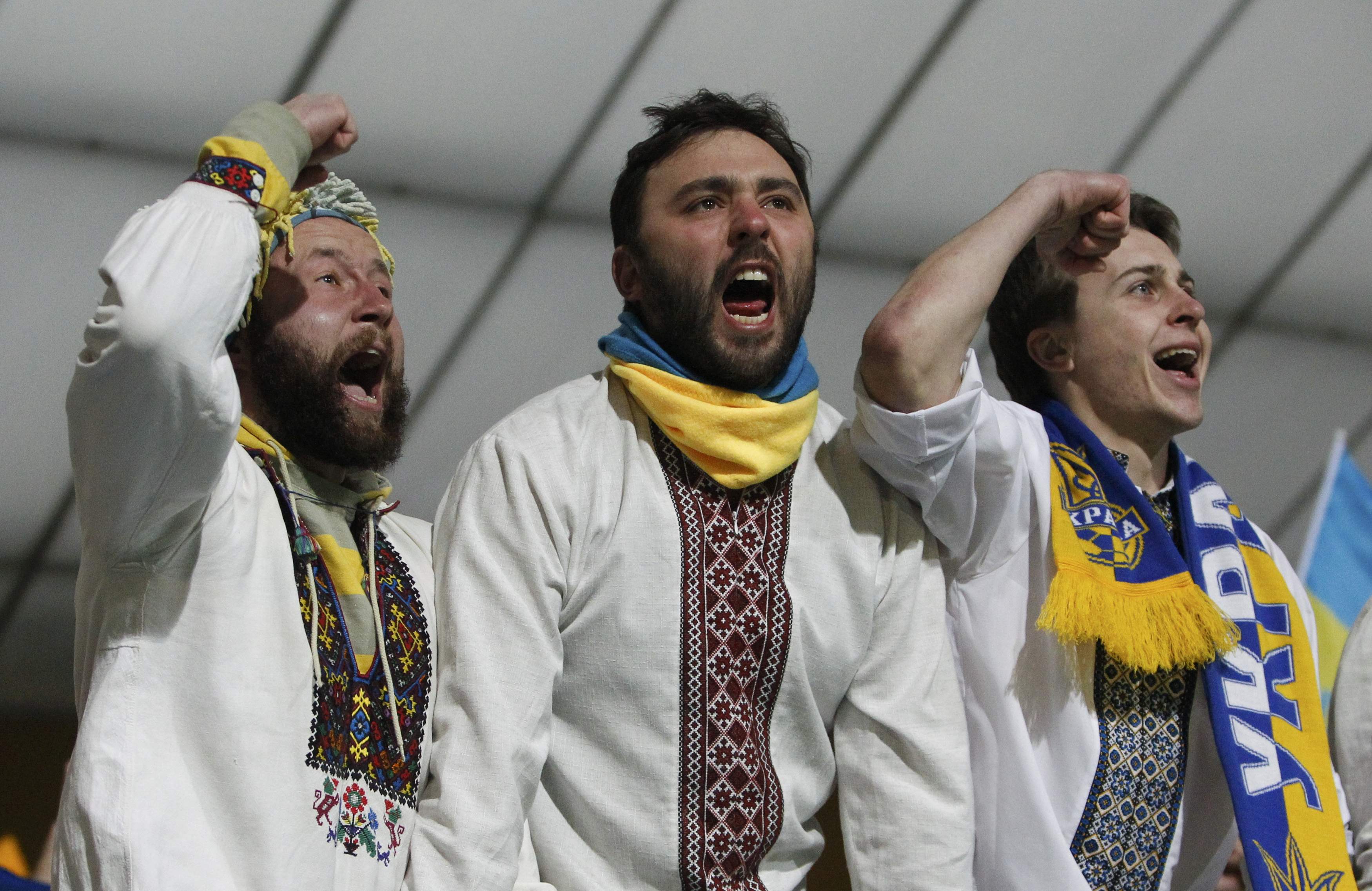 Вболівальники збірної України святкують перемогу національної збірної над Словенією у плей-офф до Євро-2016. Українські футболісти зіграли із суперником внічию 1:1 і здобули право виступати у фінальному турнірі чемпіонату Європи. / © Reuters