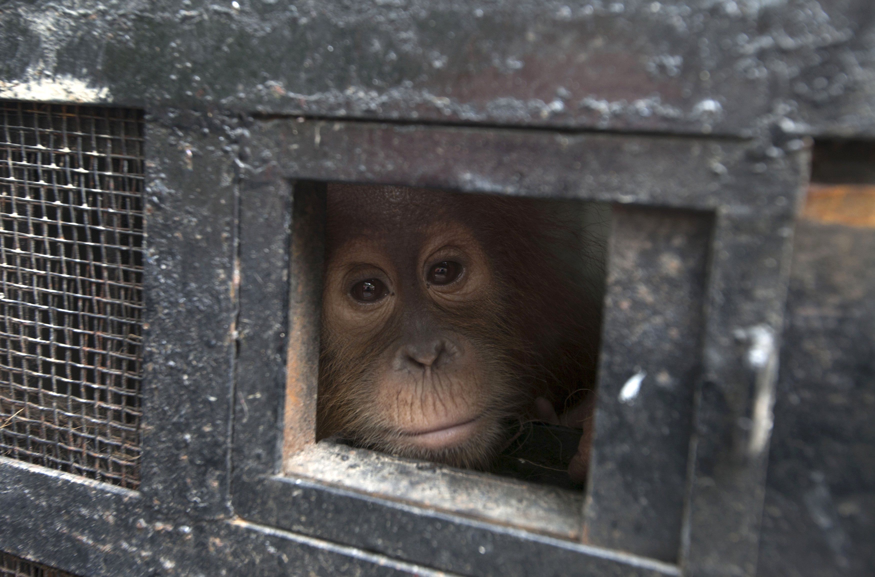 Молодий орангутанг визирає зі своєї клітки під час подорожі до Центру по збереженню орангутангів у місті Бату на острові Північна Суматра і Індонезії. Три дитинчати орангутанга були відшукані поліцією після того, як заарештували торговців дикої природи. / © Reuters