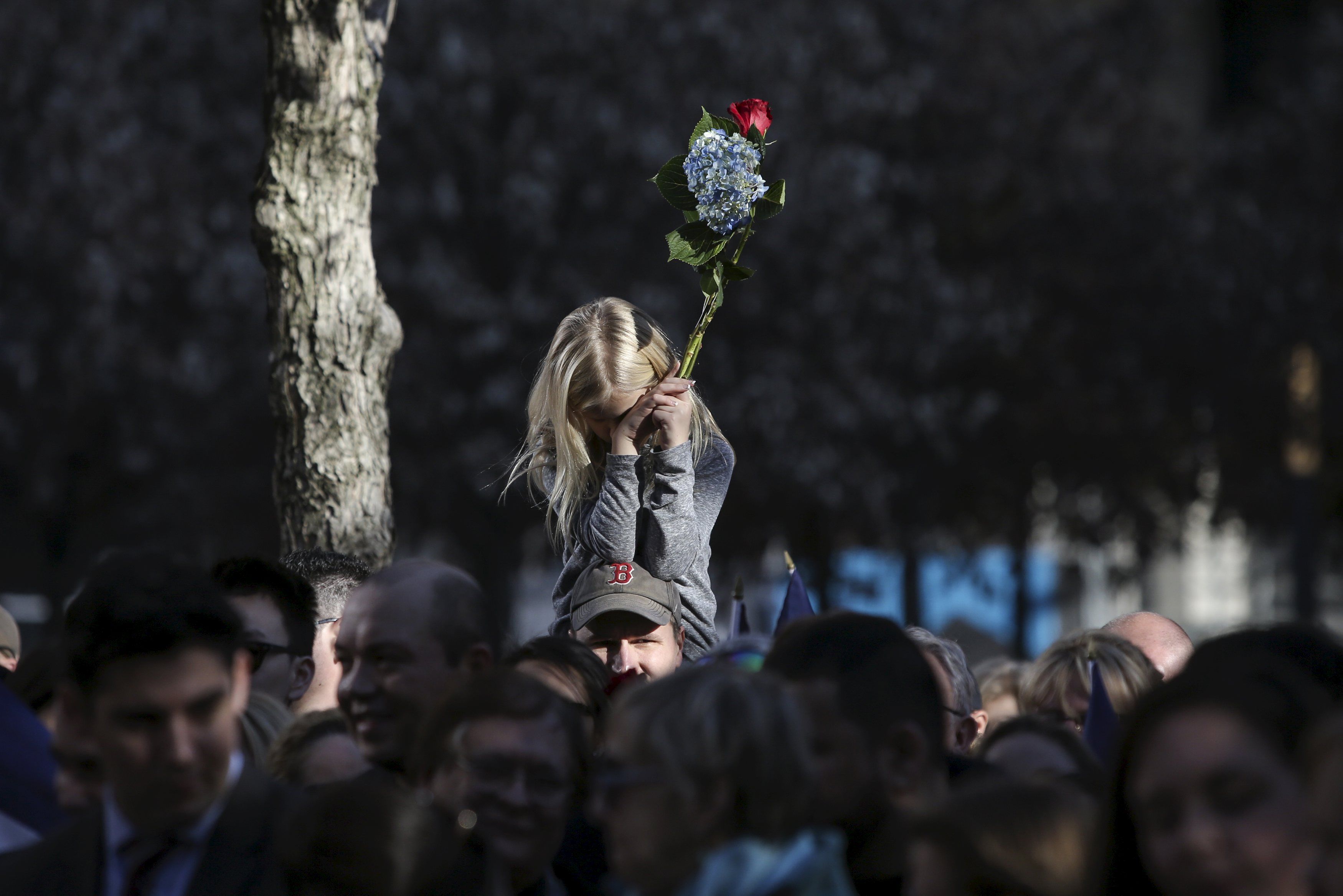 Дівчина з квітами в руках плаче під час вшанування пам’яті жертв атак у Парижі. Акція відбулася у Національному Меморіалі 11 вересня у Манхеттені, Нью-Йорк. / © Reuters
