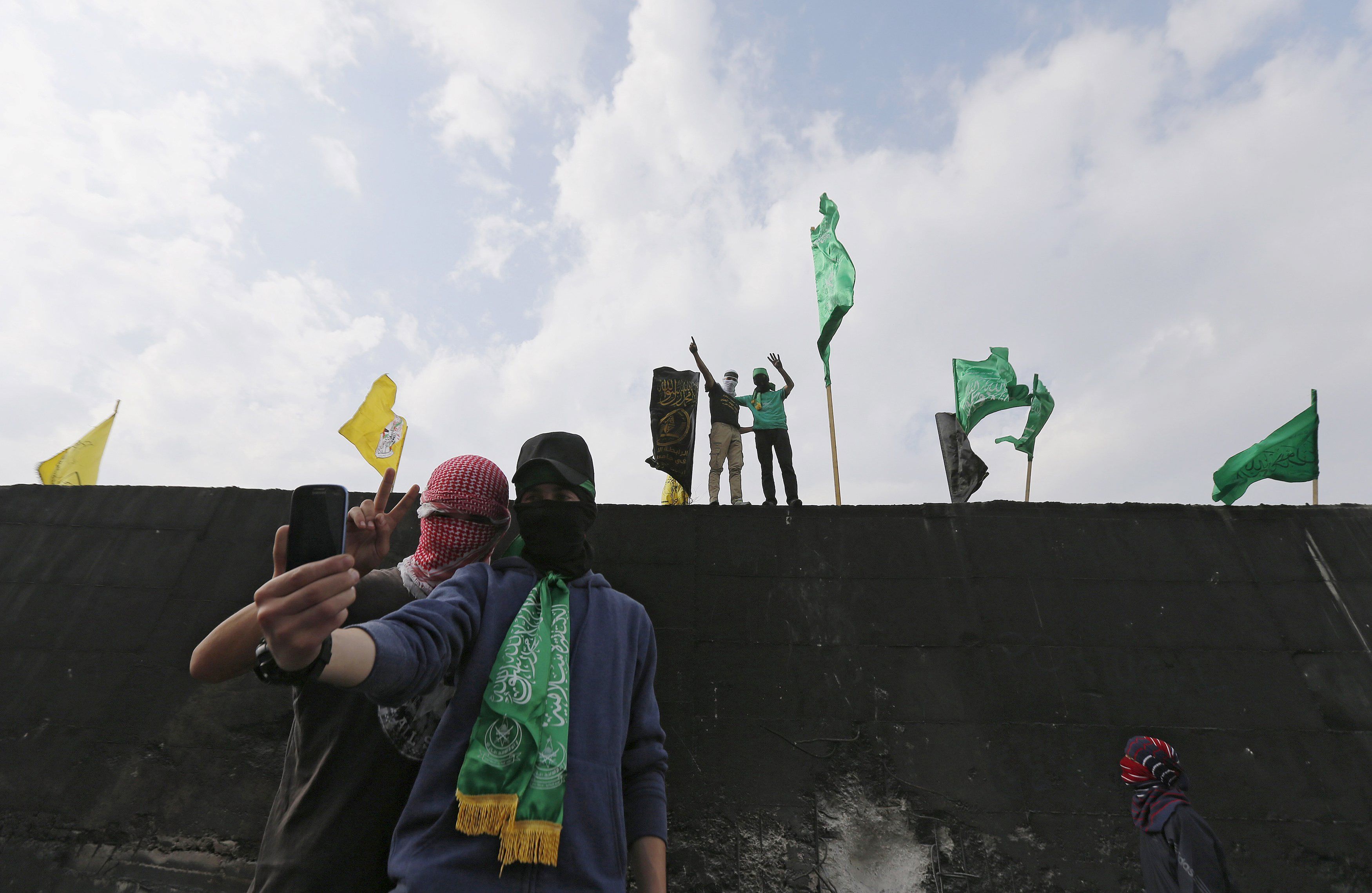 Палестинські демонстранти знімають селфі перед секцією ізраїльської стіни, яка відокремлює місто Абу-Діс з Єрусалимом, під час антиізраїльської акції протесту. / © Reuters