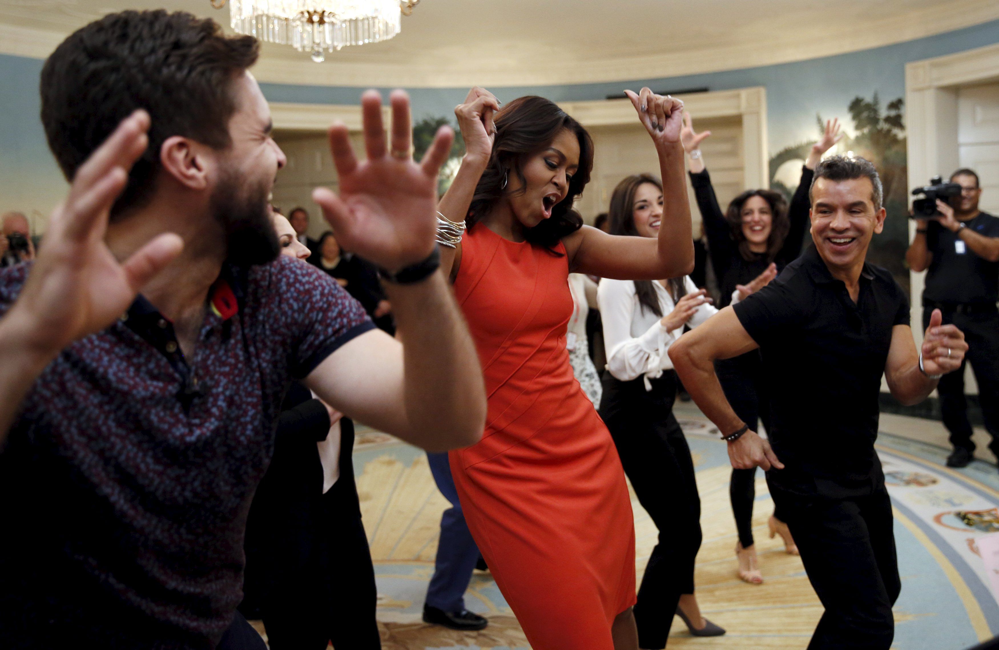 Перша леді США Мішель Обама танцює танець Конга з актором Джошем Сегарра і хореографом Серхіо Трухільо під час студентської майстерні, присвяченій історії Бродвею, в Білому домі у Вашингтоні. / © Reuters