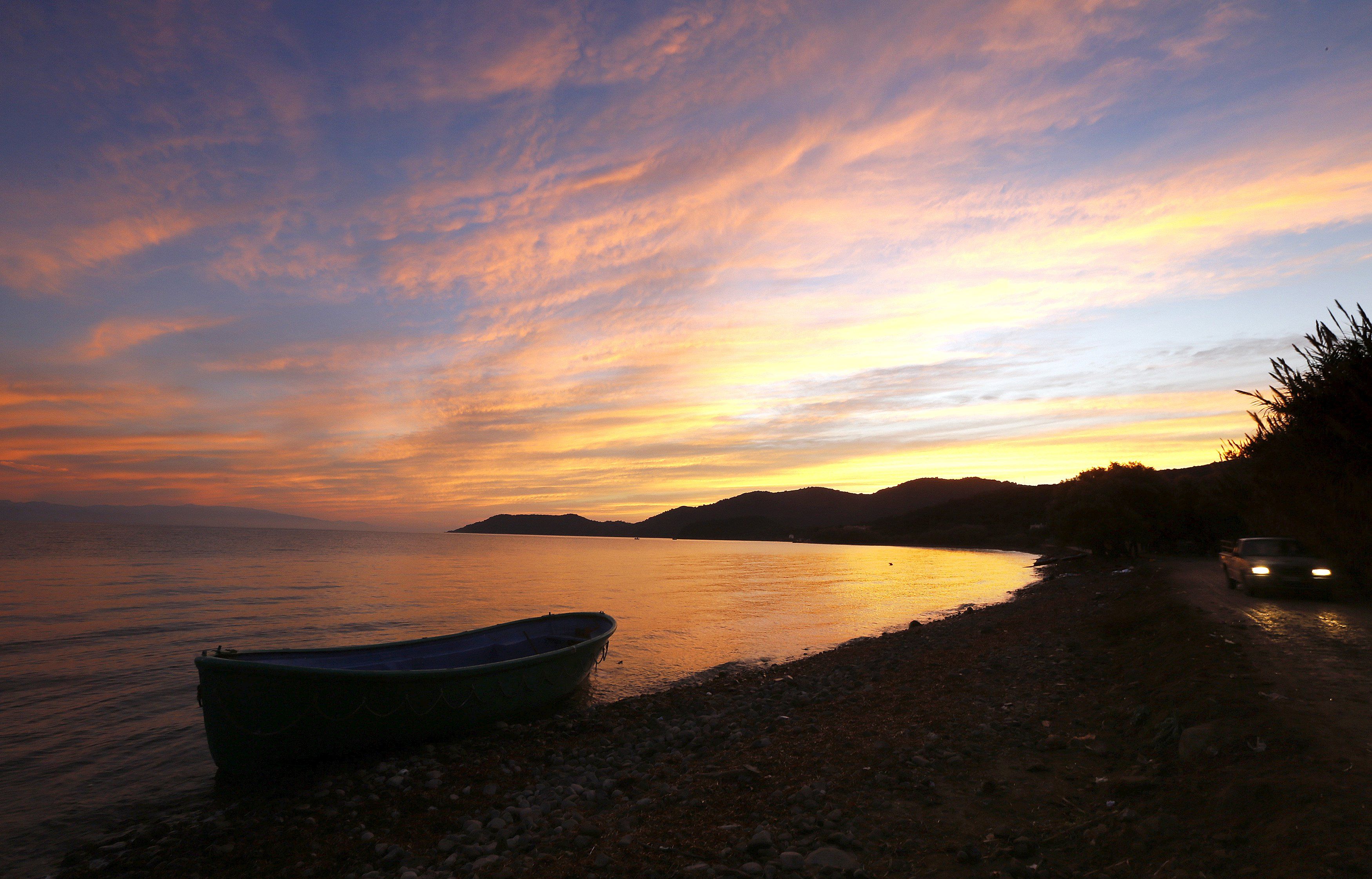 Місцевий фермер їздить на пікапі по дорозі у той час, як на пляжі стоїть дерев'яний човен біженців, на якому вони прибули до грецького острова Лесбос. Із 660 000 мігрантів, які потрапили до Греції в цьому році, більше половини прибули на Лесбос. В цьому році понад 3460 біженців загинули при перетині Середземного моря, 360 з них - в останні чотири місяці, 250 з них - в грецьких територіальних водах. / © Reuters