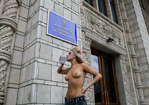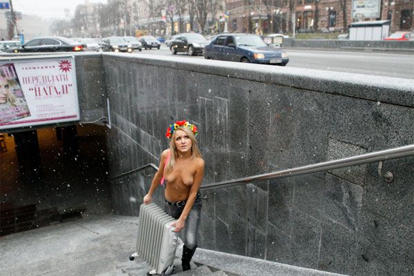 Під мерією Києва активістки жіночого руху FEMEN провели акцію протесту "На морозі" проти відключення опалення у столиці, яке відбулося через борги за газ.