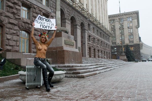 У 10-градусний мороз представниця FEMEN роздяглася по пояс і розгорнула плакат, адресований градоначальнику Києва Олександру Попову: "Попов, підігрій попу!". З собою під мерію активістки принесли електрообігрівач. / © Жіночий рух FEMEN