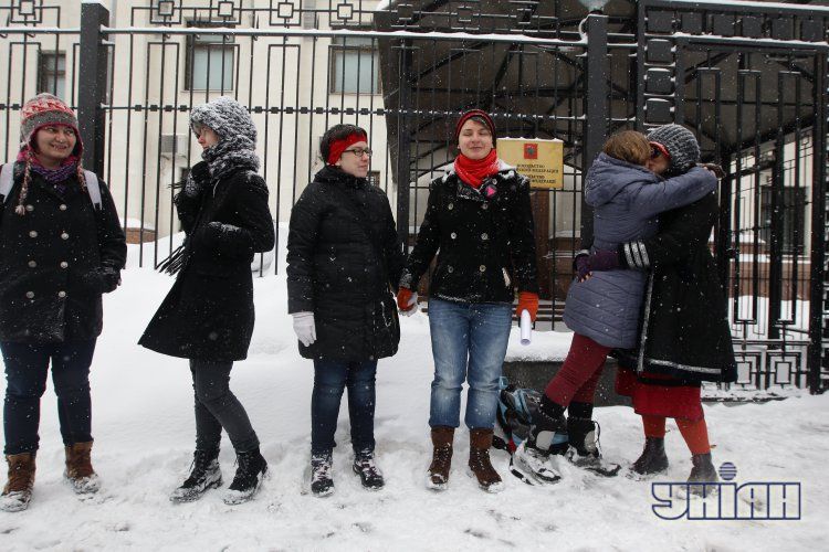 Сьогодні, 31 січня, у Києві біля будівлі посольства Російської Федерації столичні лесбіянки провели акцію солідарності з громадянами Росії, які борються з гомофобними, на їх думку, законодавчими ініціативами.