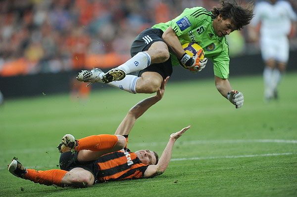 Голкіпер "Динамо" Шовковський перелітає через "гірника". / © ФК "Шахтар"