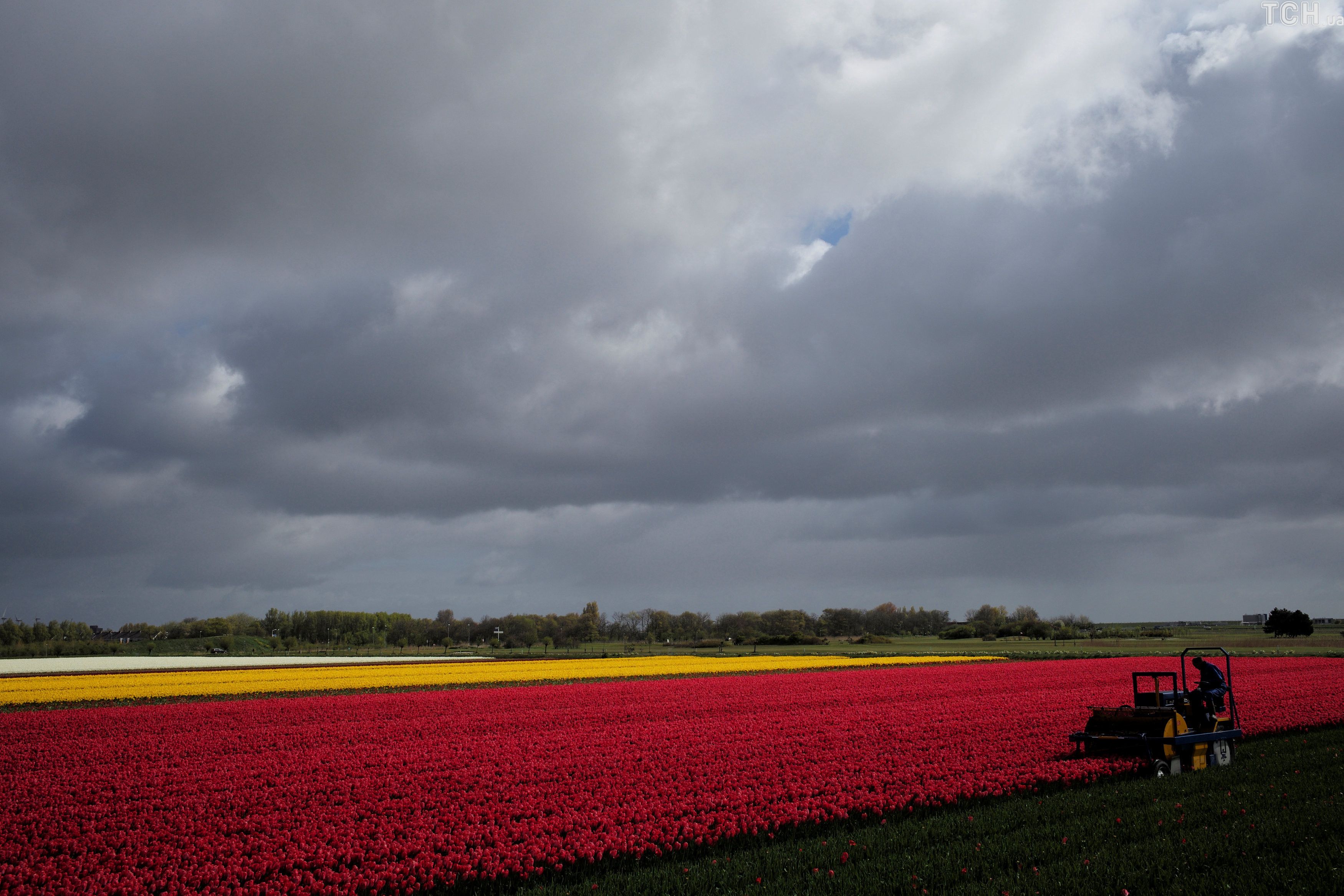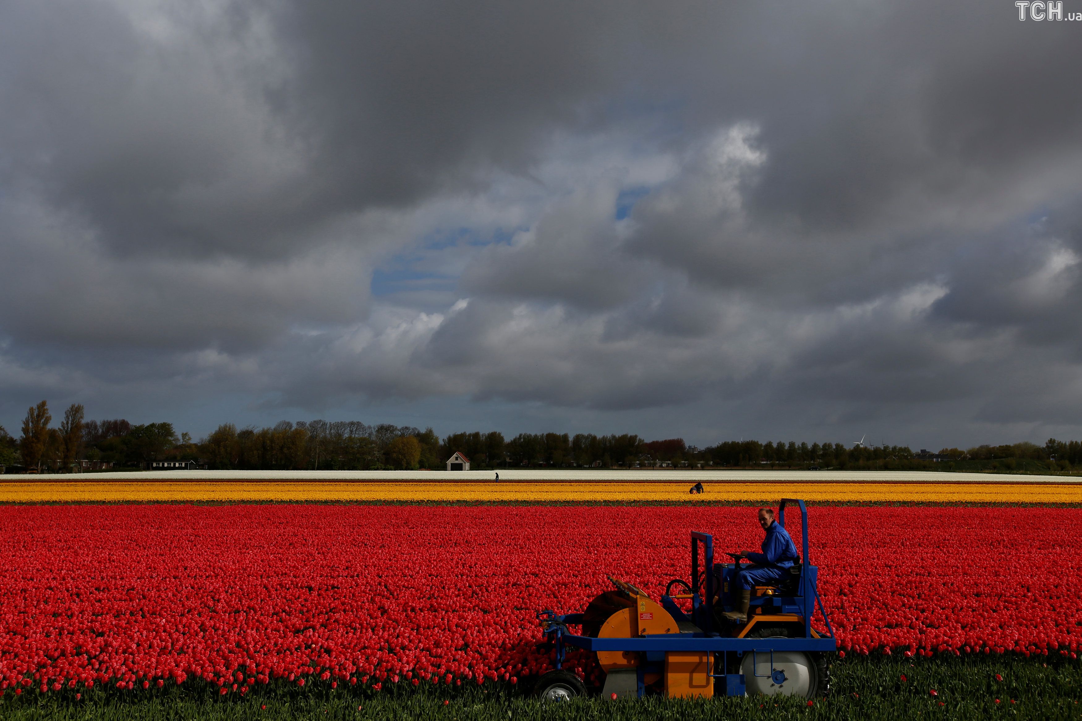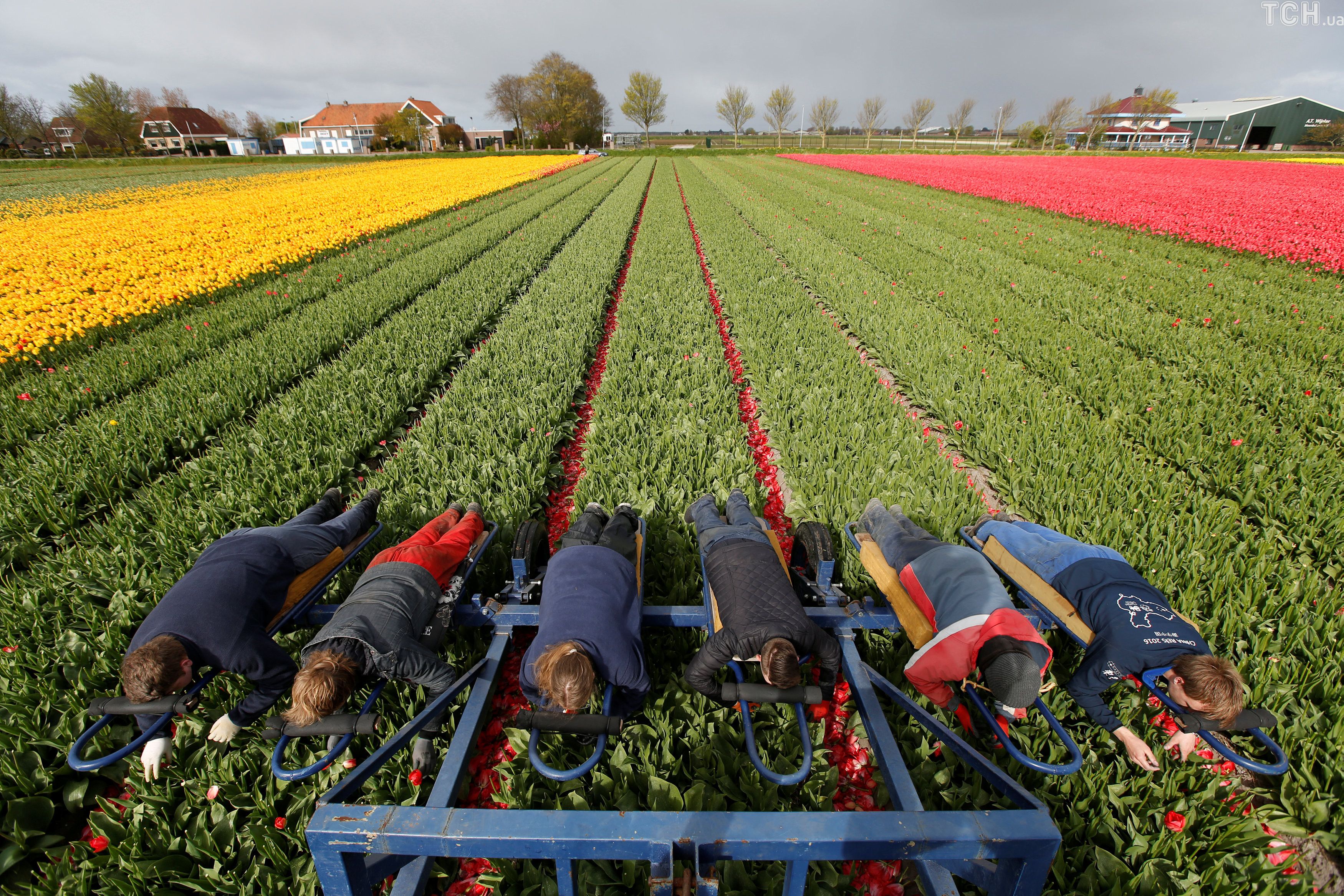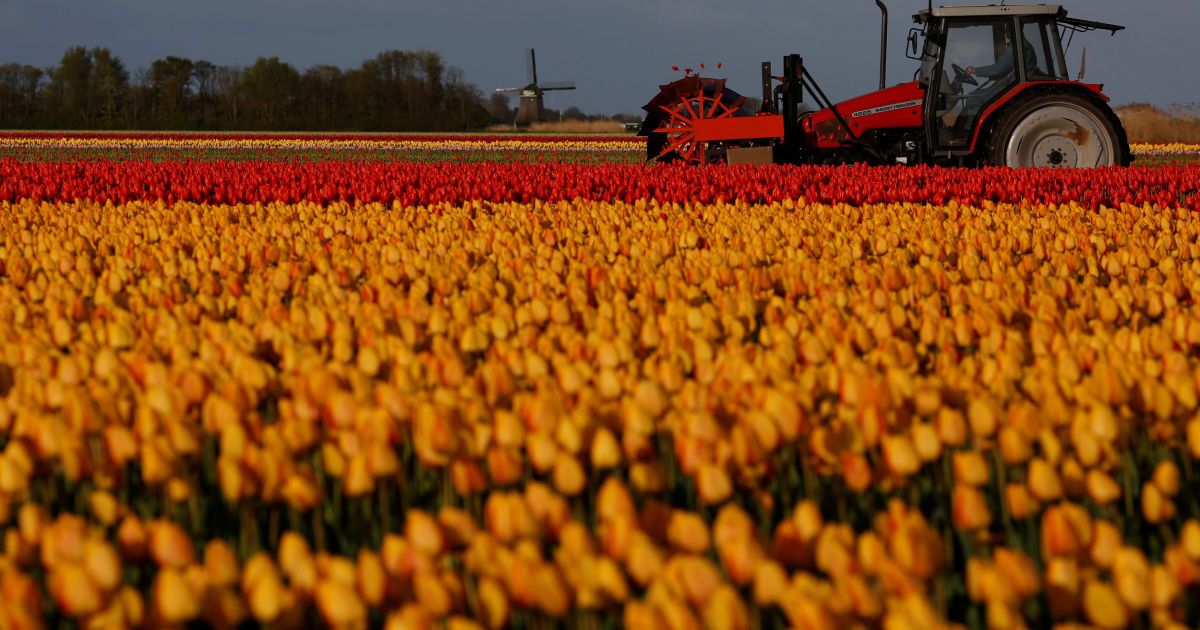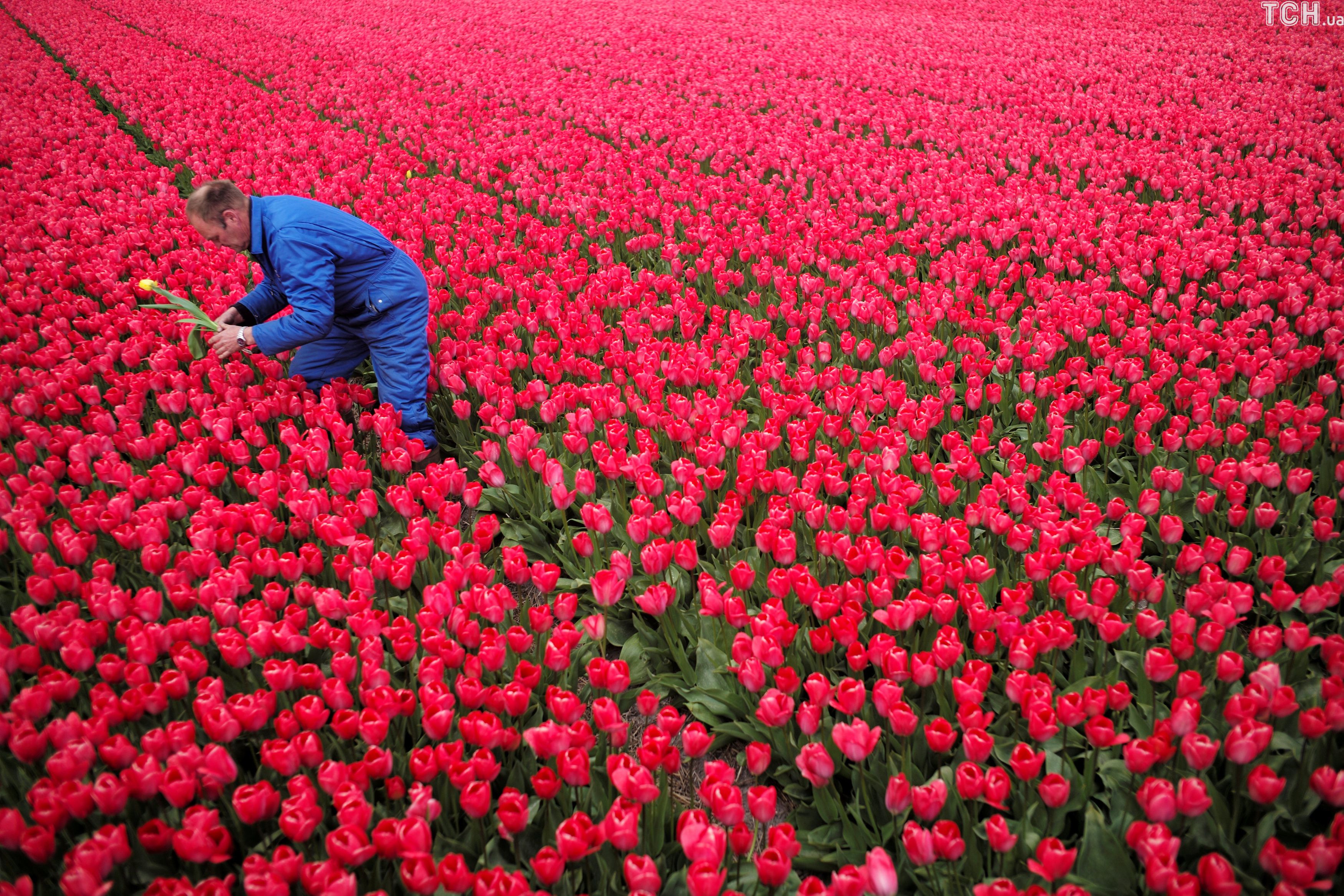 На грандіозних квіткових полянах працюють фермери. Вони, наприклад, прибирають жовті квіти, які ненароком виросли поміж червоних або лежачи відрізають тюльпани, які залишилися після збору врожаю квітів трактором.