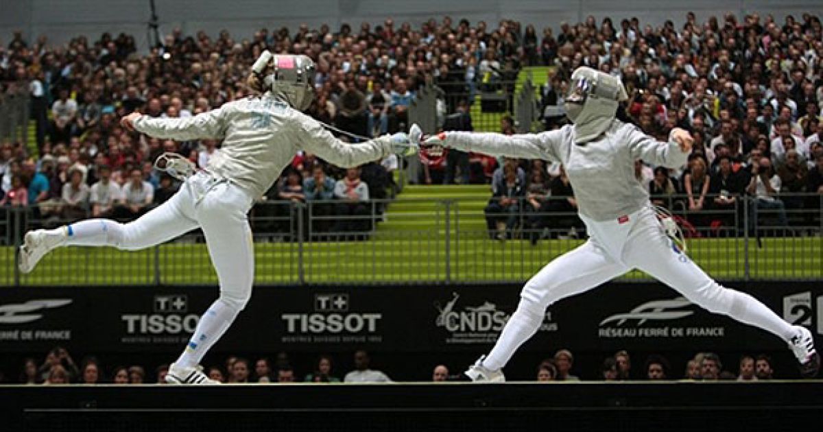 Франція, Париж. Українська фехтувальниця Ольга Харлан (ліворуч) змагається на шаблях з росіянкою Софією Великою під час Чемпіонату світу з фехтування, який відбувся у Парижі. Перемогу у змаганнях отримала американська спортсменка Маріель Загінус, срібло завоювала українка Ольга Харлан. / © AFP