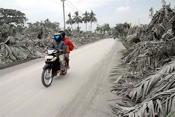 Індонезія, Слеман. Місцеві мешканці на мотоциклі їдуть крізь село, вкрите вулканічним попелом у центральній частині Яви. Через виверження вулкана Мерапі у Індонезії загинули 85 осіб, велика кількість людей отримала важкі опіки. / © AFP