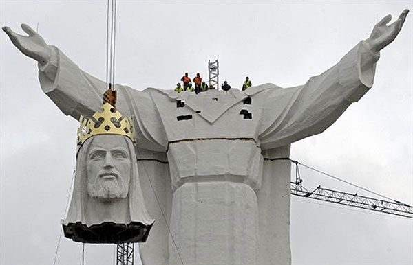 Польща, Свебодзін. Голову найбільшої в світі статуї Ісуса Христа піднімають на крані перед тим, як встановити статую у польському місті Свебодзін. Встановлення статуї висотою 58 метрів планують завершити до 21 листопада. / © AFP