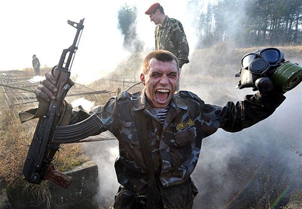 Білорусь, Мінськ. Солдат МВС Білорусі кричить після проходження через дим на смузі перешкод під час суворого фізичного іспиту на "Краповий берет". / © AFP