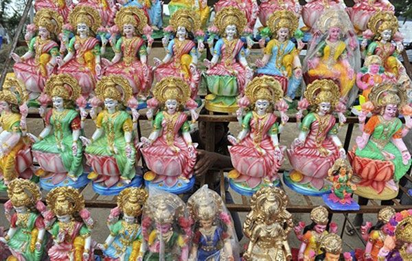 Індія, Хайдарабад. Індійський працівник поправляє статуї індуїстської богині Лакшмі, яка символізує гроші та багатство, виставлені у придорожньому кіоску в Хайдарабаді. В Індії відзначають свято вогнів Дівалі. / © AFP