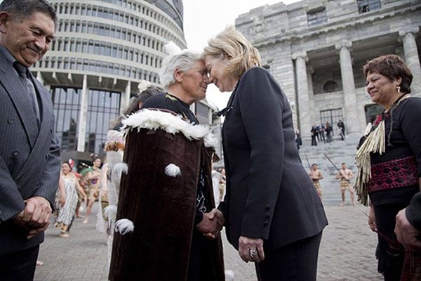 Нова Зеландія. Державний секретар США Гілларі Клінтон зустрічається з Роуз Парей, старійшиною парламенту Нової Зеландії, під час візиту до парламенту у Веллінгтоні. Клінтон відвідала Нову Зеландію для підписання угоди, яка відзначає відлигу у відносинах між країнами після сварки через ядерну зброю, що тривала протягом чверті століття. / © AFP