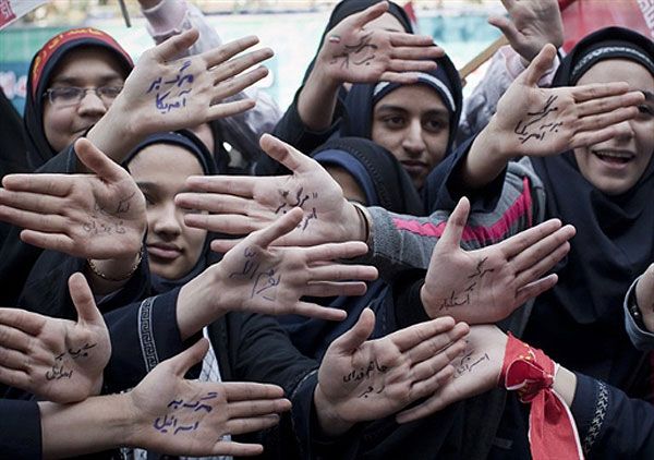 Іран, Тегеран. Іранські жінки і школярки показують свої долоні, на яких написані антиамериканські, антиізраїльські і антиурядові гасла, під час мітингу перед колишнім посольством США у Тегерані. Таким чином вони відзначили 31-у річницю захоплення посольства ісламістськими студентами. / © AFP