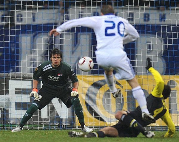 Україна, Київ. Гравець "Динамо" (Київ) Олег Гусєв намагається забити гол у ворота Серхіо Ромеро, голкіпера АЗ Алкмаар, під час матчу Ліги Європи УЄФА у Києві. / © AFP