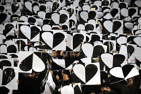 Сербія, Белград. Прихильники "Партизана" (Бєлград) тримають плакати із зображенням сердець під час матчу Ліги Чемпіонів УЄФА "Патризан"-"Брага". / © AFP