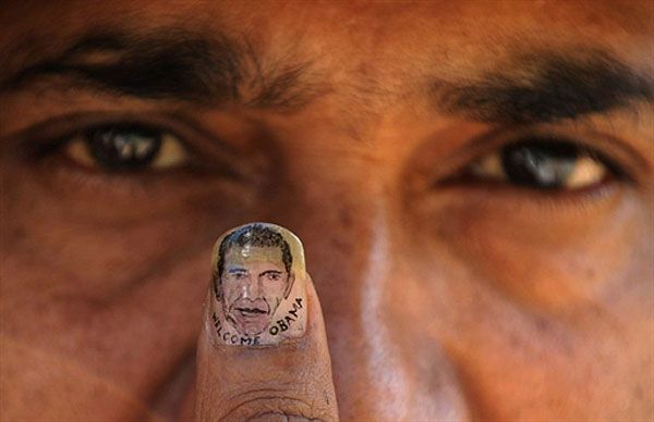 Індія, Сілігурі. Індійський художник-мініатюрист Рамеш Саа демонструє ніготь, на якому намальоване зображення президента США Барака Обами, перед візитом Обами до Індії. / © AFP