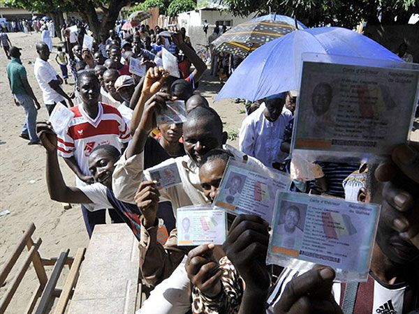 Кот-д'Івуар, Абіджан. Гвінейські жителі Кот-д'Івуара показують свої виборчі карти, доки вони стоять у черзі на виборчу дільницю в Абіджані. / © AFP