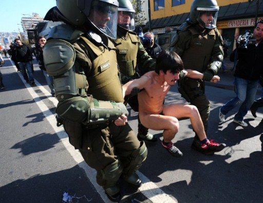 Чилі, Вальпараїсо. Голого демонстранта заарештовують поліцейські під час зіткнень на акції протесту поблизу Конгресу Вальпараїсо, де президент Чилі Себастьян Піньєра виступає зі своїм щорічним зверненням до нації. / © AFP