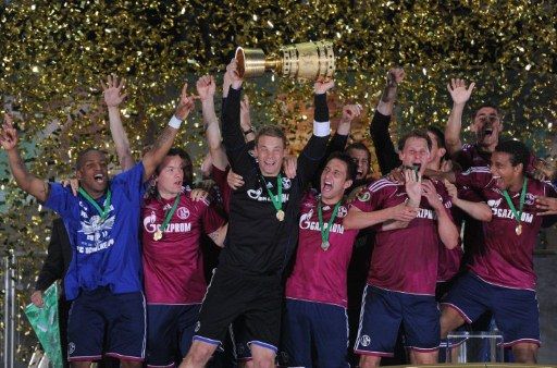 Німеччина, Берлін. Голкіпер "Шальке" Мануель Нойер тримає кубок, коли він та його товариші по команді святкують перемогу у фіналі Кубка Німеччини проти "Дуйсбурга" з рахунком 5:0. / © AFP