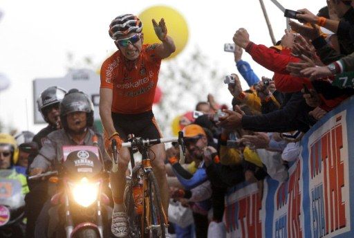 Італія, Монте Зонколан. Іспанський велогонщик Ігор Антон Еускатель-Еускаді святкує перемогу після перетину фінішної лінії під час 14-го етапу 94-ої велогонки "Тур Італія". / © AFP