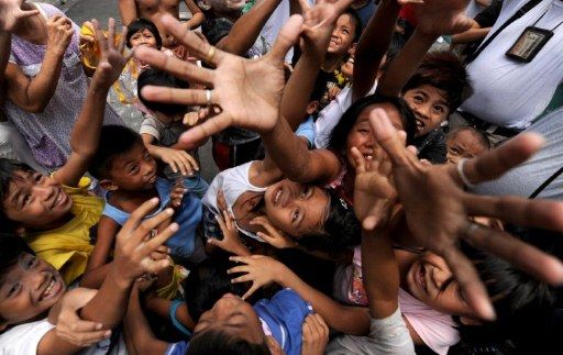 Філіппіни, Маніла. Філіппінські діти і жінки ловлять іграшки та інші предмети, які розкидають у повітря під час вуличних урочистостей на щорічному святі, Дні Святої Рити з Касії. / © AFP