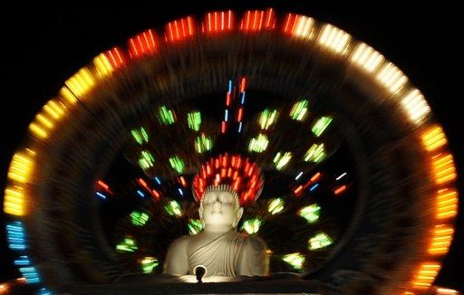 Шрі-Ланка, Коломбо. Гігантська статуя сидячого Будди, підсвічена на честь святкування Дня Тесак у Коломбо. Буддійське свято День Тесак відзначає народження, просвітлення і відход Будди. / © AFP