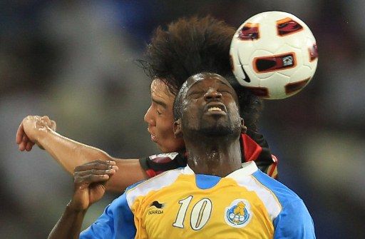 Катар, Доха. Івуарійський нападаючий команди Катару "Аль-Гаррафа" Амара Діане веде боротьбу за м’яч південнокорейським захисником "Аль-Райяну" Чо Єн Хеном під час фінального матчу на Кубок еміра. / © AFP